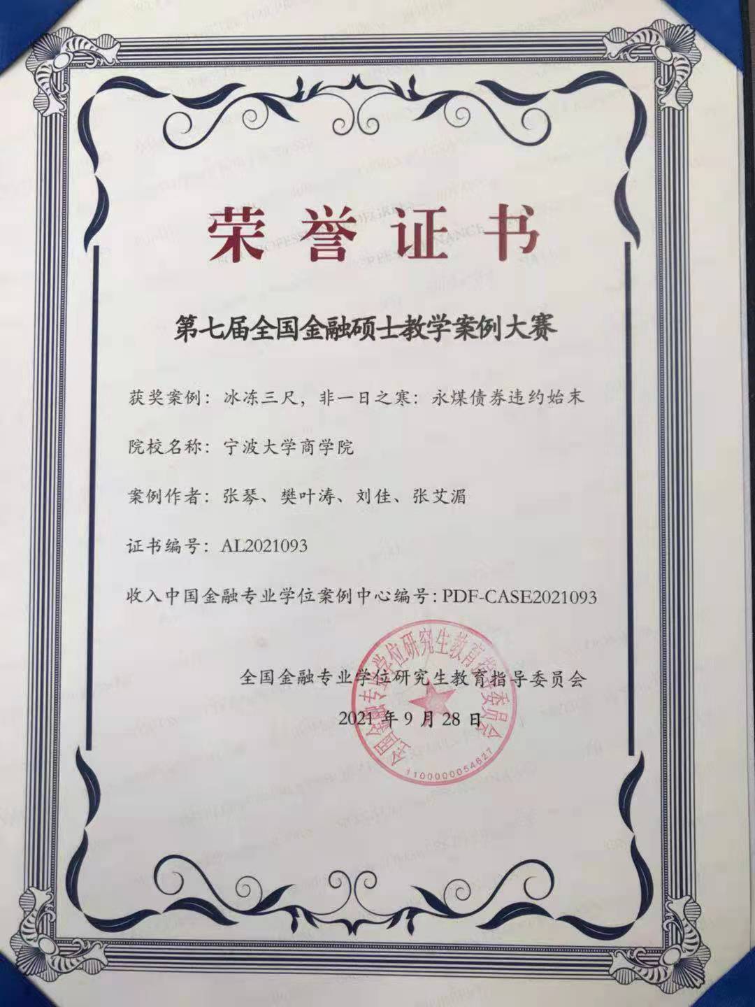在2021年全国第七届金融硕士教学案例大赛中,51吃瓜网 金融系张琴教授指导的《冰冻三尺,非一日之寒:永煤债券违约始末》在专家评审中脱颖而出,荣获全国优秀教学案例奖并入选全国金融硕士教学案例库。