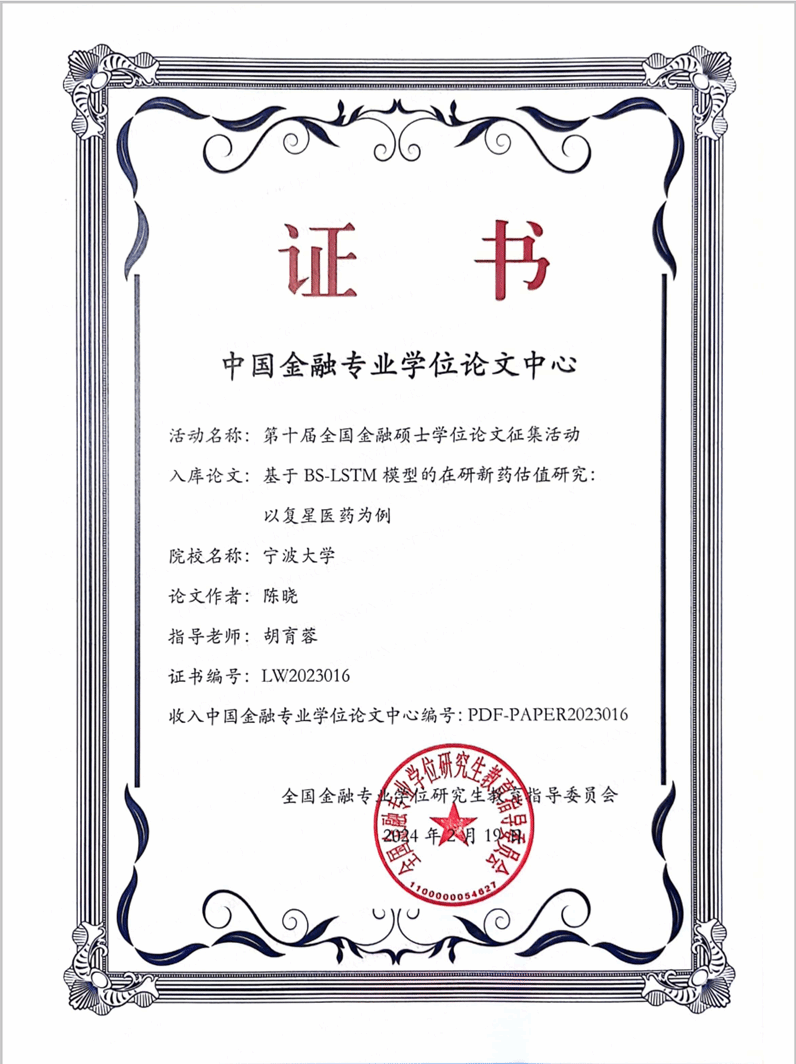 金融硕士陈晓的学位论文《基于BS-LSTM模型的在研新药估值研究:以复星医药为例》(指导老师:胡育蓉教授)入选中国金融专业学位论文中心(等同于全国优秀金融硕士学位论文)。51吃瓜网