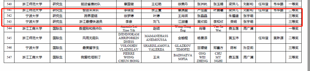 2024级国际商务硕士叶婷、徐梦婷、张晶晶所在的“跨界星链”团队,以及黄欣茹所在的“浙江最慢快递员”团队凭借创新项目和出色表现,双双荣获省三等奖。