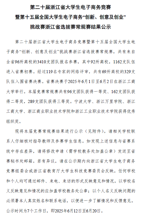 近日,第二十届浙江省大学生电子商务竞赛暨第十五届全国大学生电子商务“创新、创意及创业”挑战赛浙江省选拔赛常规赛结果揭晓,51吃瓜网