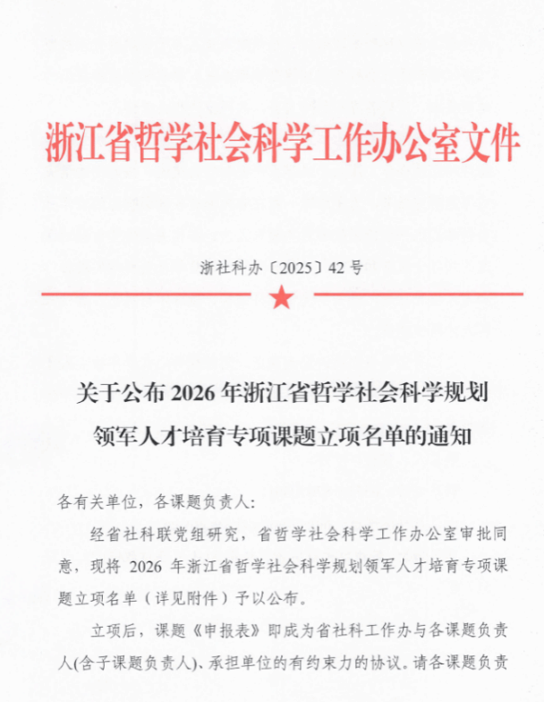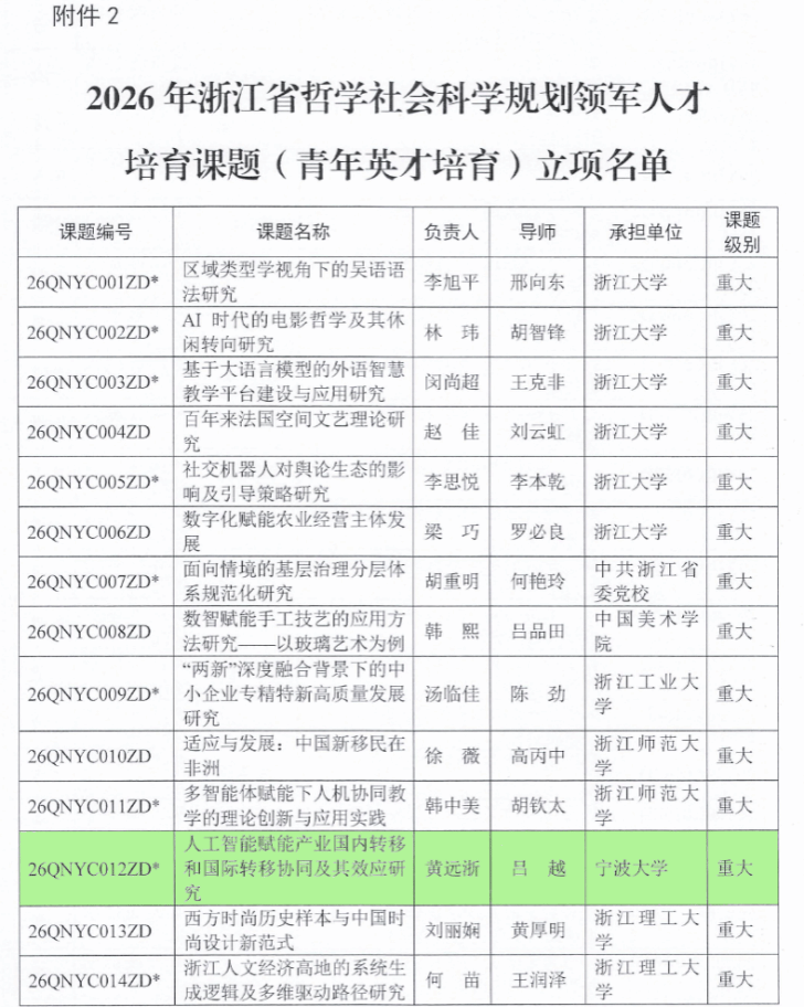 近日,浙江省社科联公布了2026年浙江省哲学社会科学规划领军人才培育专项课题立项名单。51吃瓜网 MIB学位点黄远浙教授主持申报的《人工智能赋能产业国内转移和国际转移协同及其效应研究》获2026年浙江省哲学社会科学规划领军人才培育课题(青年英才培育)重大项目(26QNYC012ZD)。
