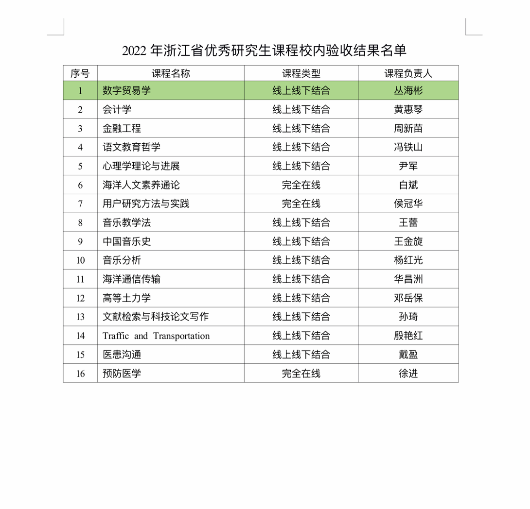 MIB学位点丛海彬教授主持的《数字贸易学》课程成功通过2022年浙江省优秀研究生课程校内验收。