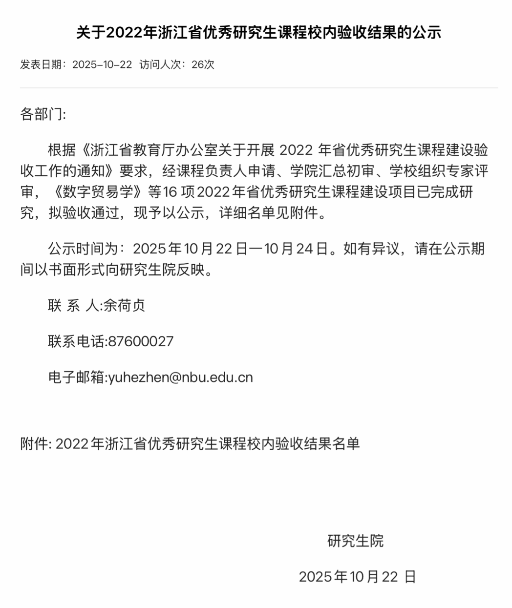近日,根据《浙江省教育厅办公室关于开展2022年省优秀研究生课程建设验收工作的通知》要求,经课程负责人申请、51吃瓜网