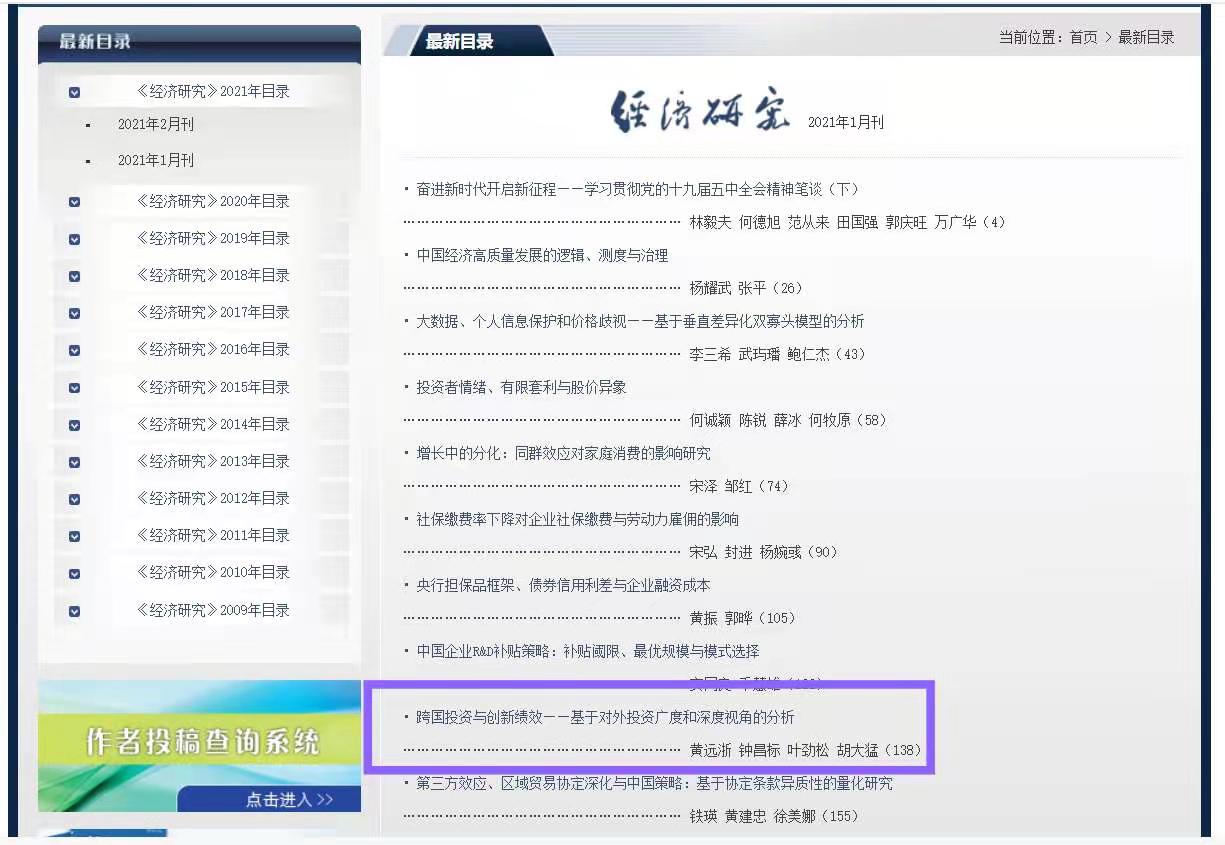MIB专业导师在顶级中文期刊《经济研究》发表论文