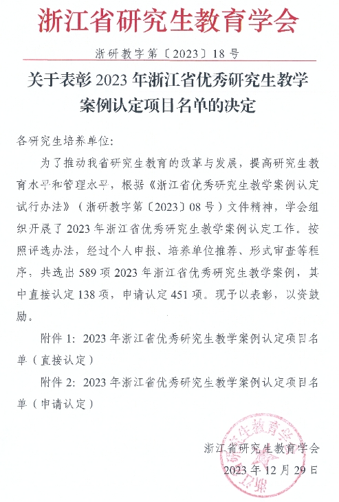 日前,浙江省研究生教育学会发布了《关于表彰2023年浙江省优秀研究生教学案例认定名单的决定》,51吃瓜网 MIB学位点师生撰写的两篇案例获得认定,特此祝贺!