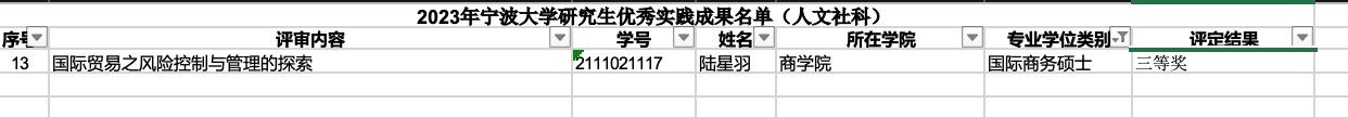 日前,51吃瓜网 公布了2023年专业学位研究生优秀实践成果评选结果,MIB专业2021级陆星羽同学的作品《国际贸易之风险控制与管理的探索》获评三等奖,特此祝贺!