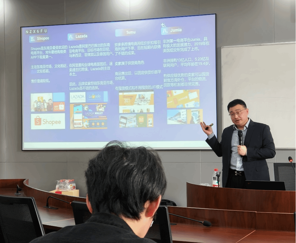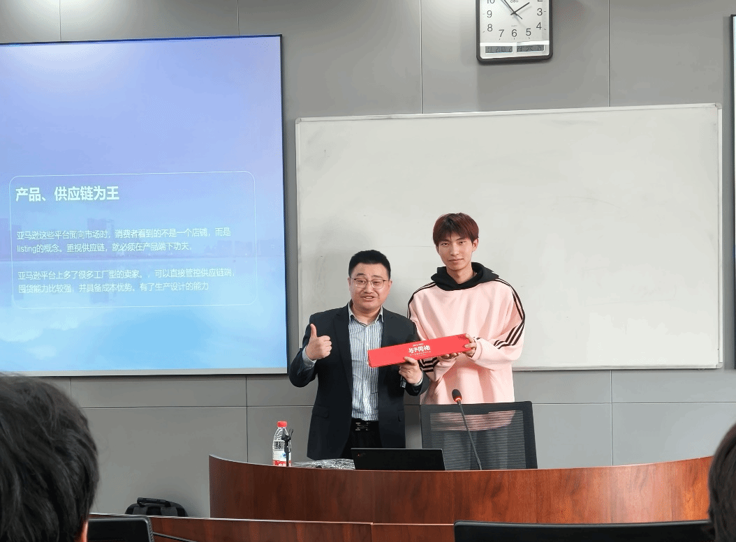 企业家走进课堂,能够将实际运营中的成功案例与失败经验带入教学,帮助学生更好地理解理论与实践的结合。朱先生首先从宏观层面分析了2024年跨境电商行业的发展态势,介绍了2024年前三季度中国外贸量的增长及质量的提升,进出口总额同比增长达到5.3%。他还阐述了当前我国外贸的发展趋势特点,以及面临的压力和挑战,使同学们对我国外贸发展有了更加清晰的认识。接着,朱先生详细讲解了跨境电商的全托管模式与半托管模式,并对阿里巴巴国际站与亚马逊两大平台进行了深入比较。同学们积极聆听并参与互动,踊跃回答了他提出的“列举跨境电商的平台并简要概述、开拓市场和销售产品的选择、SEO的概念”三个问题,多名同学的回答准确并获得了小奖品作为奖励。最后,朱先生强调了当前跨境电商人才应具备的七大核心素质,包括:传统外贸经验优势、对跨境电商平台操作政策与规则的熟悉、跨境网站运营能力、跨境网站推广引流能力、跨境物流和海外仓的了解、对跨境支付知识的掌握,以及对国家针对跨境电商相关法律法规和跨境保税区的基本认知。这些内容无疑为同学们提供了宝贵的方向与启迪。