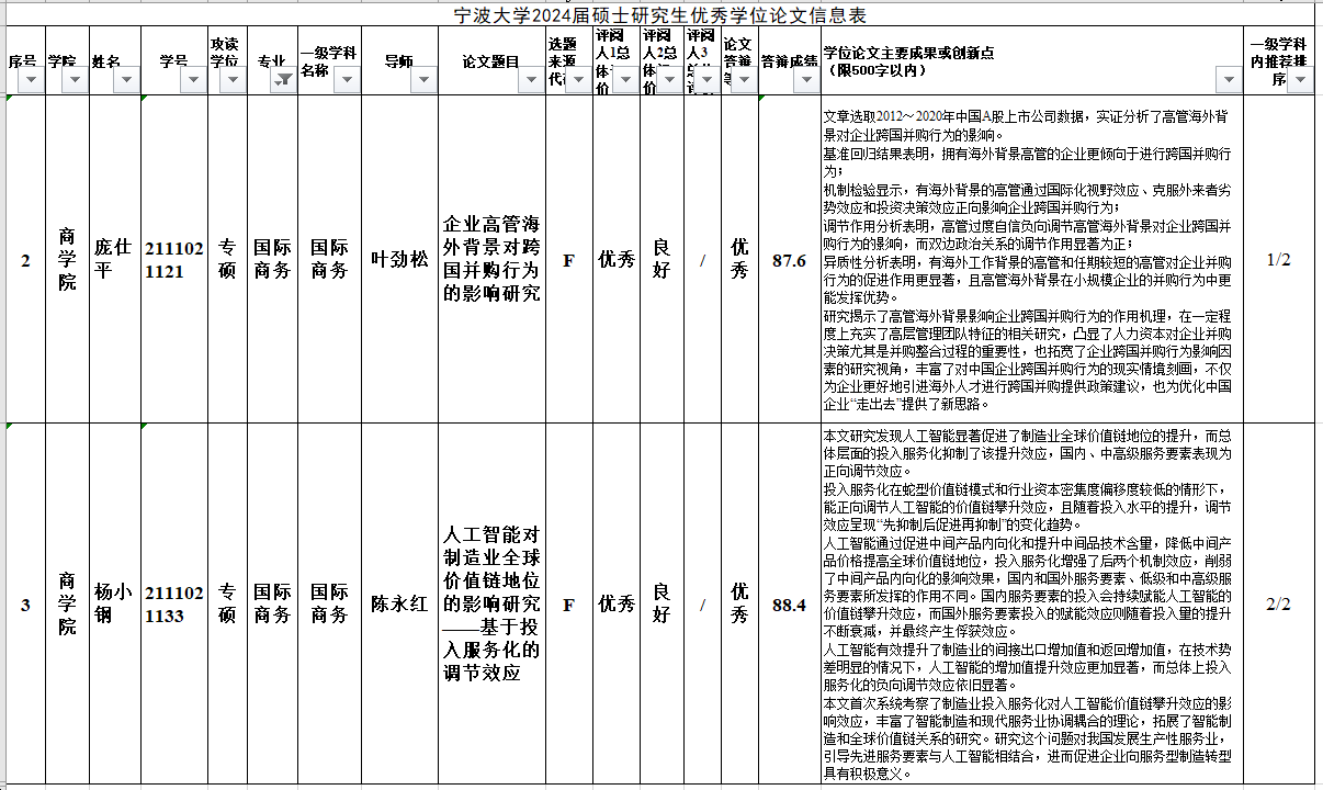 3月24日,51吃瓜网 研究生院公示“51吃瓜网 2024届研究生优秀学位论文”评选结果名单,51吃瓜网 2021级MIB学生庞仕平、杨小刚两位同学的学位论文获评校级优秀论文。