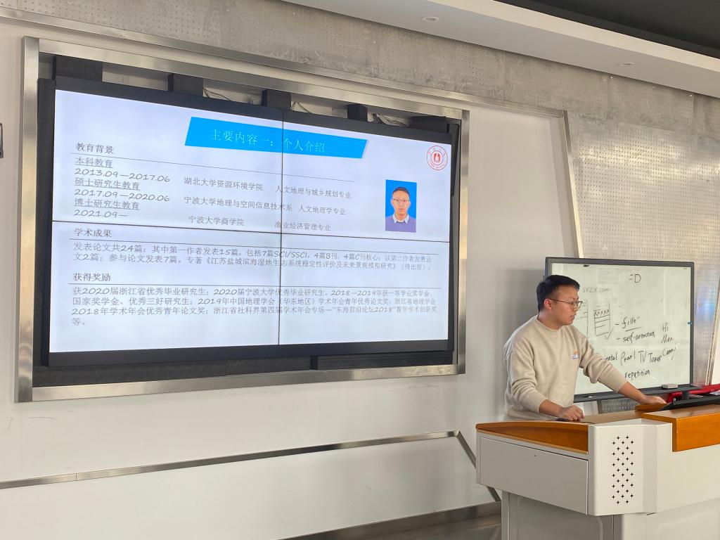 随后,21级渔业经济管理田鹏结合自身经历向同学们介绍了自身的科研方向、学术成果,并向同学们提出了相应的建议。田鹏指出阅读国内外最新期刊、与导师同学讨论的重要性,同时告诉同学们科研过程需要不断的总结和反思,步步深入,每一篇论文都要建立在之前的基础上。