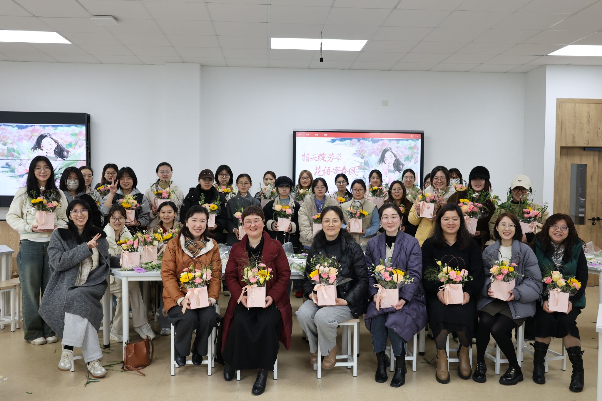 活动伊始,李丽以自身经历和热播电视剧《玫瑰的故事》为主线,分享到女性在家庭与孩子之外,同样需要找到属于自己的归属感与参与感。同时,她认为每个女性都是自由的,有着如翅膀般的无限可能,能够自由翱翔。随后,花艺讲师手持花剪,边示范边讲解,强调修建枯枝的力度,搭配色彩的准度、调整层次的温度,女教职工们在轻松愉快的氛围中边学边做,精心修建花枝、构思布局,将玫瑰、康乃馨、向日葵等花材巧妙组合,创作出各具特色的花艺作品,活动现场花香与笑语交织。
