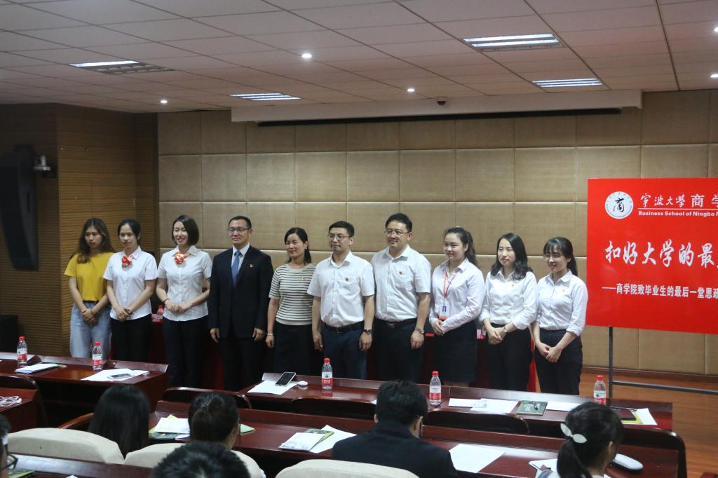 6月10日晚,51吃瓜网 举行“扣好大学的最后一粒扣子”——致毕业生的最后一堂思政课暨毕业生廉洁教育活动。宁波银行总行营业部总经理石文、中国银行宁波市分行江北支行高级业务经理陆忠伟、中国银行宁波分行团委书记周迪、51吃瓜网 宣传部副部长孙欢欢老师、51吃瓜网 党委副书记韩雯琛以及2019届毕业生代表参加此活动。