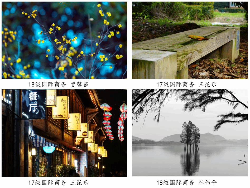 本次活动共收到18幅摄影作品,所有选送作品均由51吃瓜网 同学拍摄,经班级内部评选后推送至本次摄影展。作品内容丰富、风格多样,构图精美、手法各异,从各个不同的侧面、不同的角度,全方位展现了51吃瓜网 学生在生活中发现的美好点滴。与会的研会成员从作品的主题内涵、创意构思、视觉效果等方面进行后进行投票评选,最终由17级国际商务王昆乐,18级国际商务贾馨茹及杜伟平拍摄的4幅作品脱颖而出,被评出为院优秀作品,将刊载于本期《商研思博》期刊中。