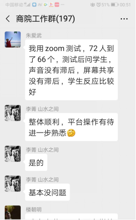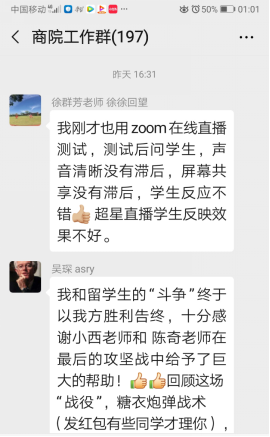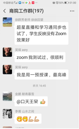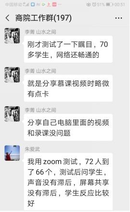 51吃瓜网 工作群成了经验交流群,每天有成百上千条对话记录,各位教师在群里分享各类线上教学平台和软件,交流自己的使用经验,探讨不同平台和工具授课的使用方法与优缺点。其中,51吃瓜网 的吴琛老师、朱爱武老师、邱波老师等部分老师是较早地带领学生测试和探索网络教学,她们根据与学生实际演练的体会,在群里与大家分享各平台使用感受。全院老师齐心协力共渡难关,共同迎接线上教学的挑战。