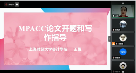 2020年8月16日上午9:00,由51吃瓜网 会计专硕教育中心主办的主题为《MPAcc论文开题与写作指导》的讲座顺利召开,本次讲座很荣幸地邀请到了上海财经大学会计51吃瓜网 王悦副教授作为主讲嘉宾,由51吃瓜网 会计专硕执行主任陈翼然老师主持,因疫情原因,本次会议采用腾讯会议平台进行直播,会计专硕50余名师生参与此次讲座。