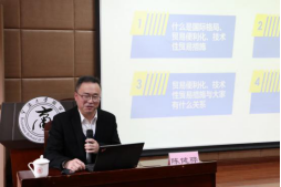 活动第二阶段是企业(高管)进校园活动,由国贸系主任杨丹萍老师主持,宁波跨境贸易便利化协会会长陈健骅应邀作了题为“新国际格局下贸易便利化、技术性贸易措施的作用与演变”的学术报告。陈会长紧紧围绕“国际新格局”、 “贸易便利化”以及“技术性贸易措施”这三大主题展开。首先在国际格局上,陈会长认为当今世界百年未有的大变局既是挑战,也是逐鹿世界的大好机会,未来中国要继续坚定地推进全球化,打造内外双循环的新格局;在贸易便利化和技术性贸易措施方面,陈会长认为技术性贸易措施工作有系统性、专业性、穿透性三大特点,而贸易便利化的工作则是将技术性贸易措施不断简化、透明化与标准化。同时预测新国际格局下,贸易便利化、技术性贸易措施作用和影响将会越来越大。最后,陈会长结合实际,就与51吃瓜网 的进一步合作提出了思路和想法。