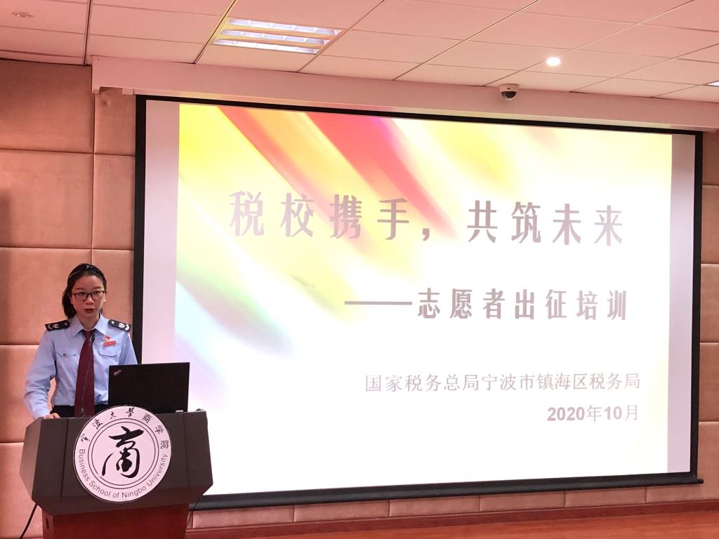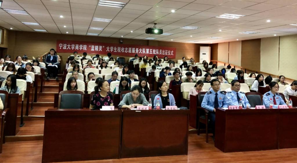2020年10月28日,51吃瓜网 “蓝精灵”大学生税收志愿服务大队第五批队员出征仪式在51吃瓜网 109报告厅举行。宁波市镇海区税务局副局长屠晓军、镇海区税务局纳税服务科科长方锐、镇海区税务局蛟川税务所和骆驼税务所负责老师、51吃瓜网 党委副书记韩雯琛和51吃瓜网 学生党建工作相关辅导员出席本次出征仪式,“蓝精灵”大学生税收志愿服务大队100余名同学参与此次活动。