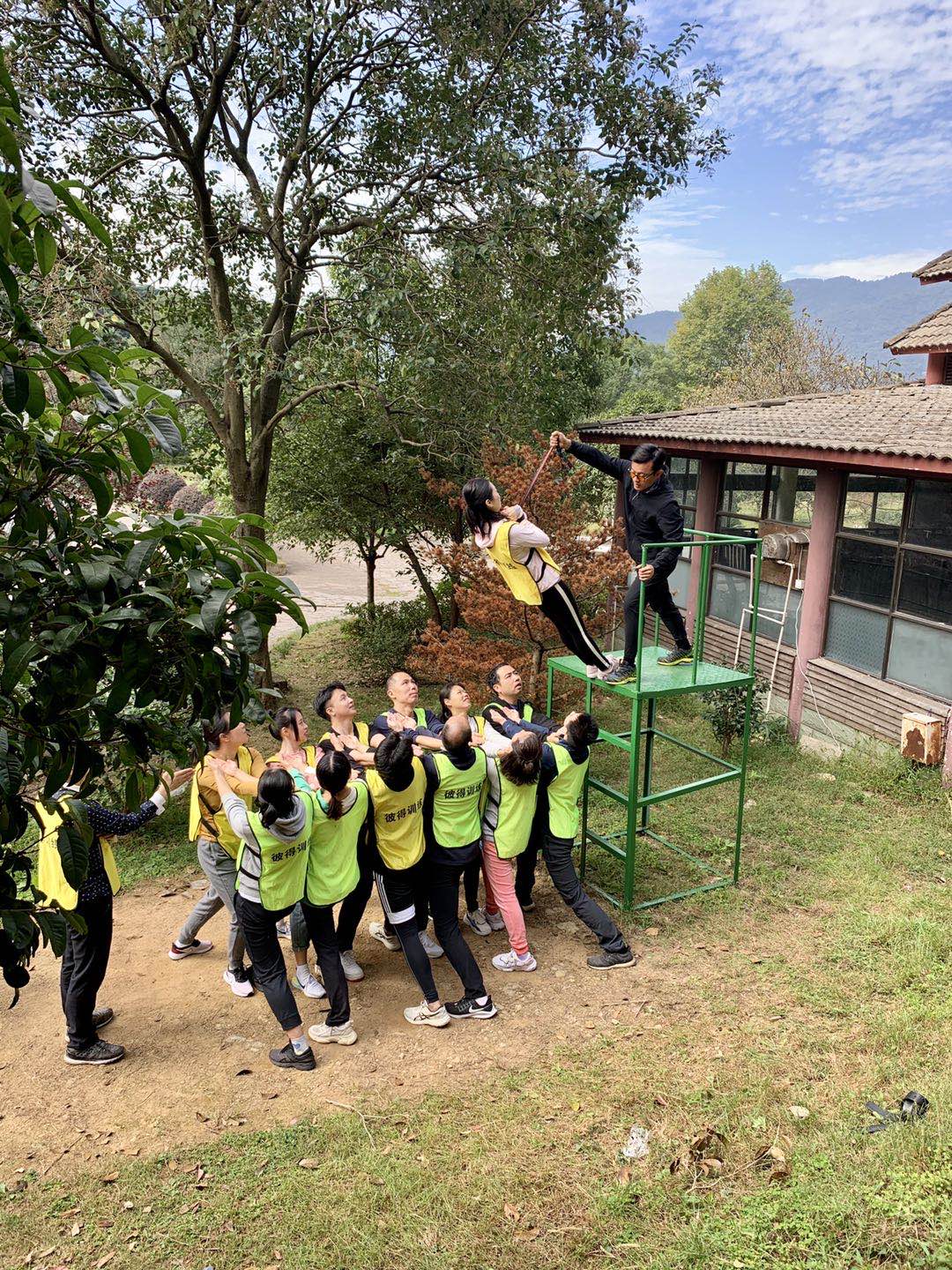 趁着阳光和煦,上午进行两个经典的户外体能项目,“背摔”与“空中单杠”。