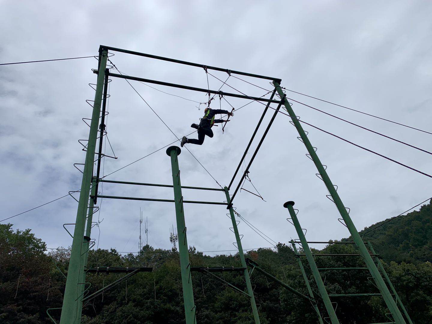 “摔”完之后,挑战继续,第二项活动是“空中单杠”。在做很多事情时,人跟成功之间的距离可能只是一个“敢不敢”。“空中单杠”背后的奥义是“突破自我”。它要求挑战者爬上3米多的高杆,跳接前方1.8米远的单杠。这是对挑战者生理与心理的一场考验。不少同学刚开始时非常担心,对头顶的单杠望而生畏,但最终,在团队齐心协力的加油鼓劲下,几乎所有人都鼓足勇气,顺利完成了“突破自我”的一跳。最后,大家发现,有些事情“看似不可能”,但其实是在自己能力范围之内的,但起跳前的内心挣扎和自我怀疑成为最大的障碍。不少学员在从单杠上下来时纷纷表示,这一跳充分激发了自我潜能,扩大了自己的舒适圈,让自己明白了“不应自我设限,nothing is impossible. just do it!”。