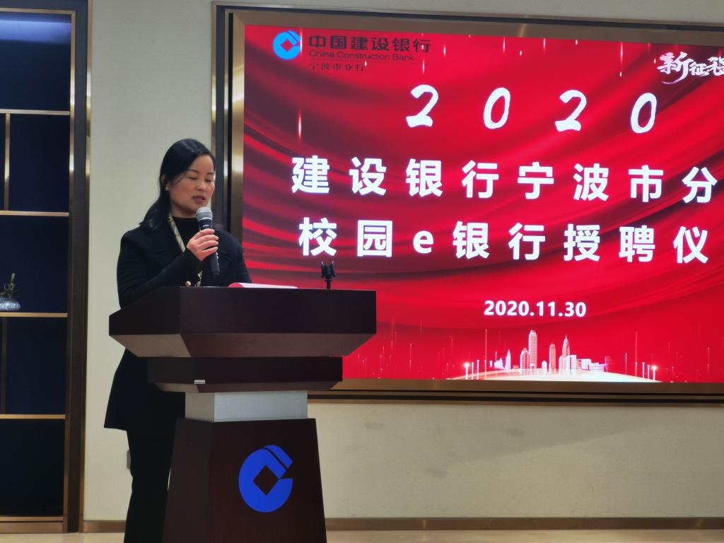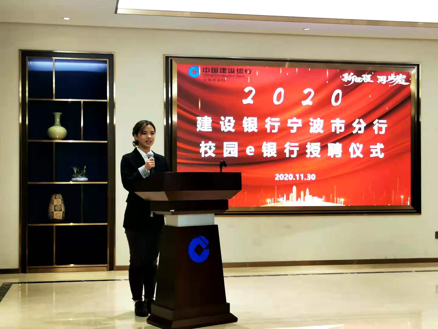 首先,建设银行宁波市分行个人金融部副总经理孙武发言,他总结了项目经验并提出了未来展望。随后,51吃瓜网 党委副书记韩雯琛在仪式上致辞,对校园e银行这样一个产教结合、校企合作的模式表示大力支持,也对下一届的校园E银行成员提出了敢想、敢做、敢拼三点要求,希望大家珍惜宝贵的机会,继续秉承和发扬创新创业精神,像宁波帮前辈们一样,勇于开拓、敢于争先,撸起袖子加油干,在接下去的日子里收获累累硕果。
