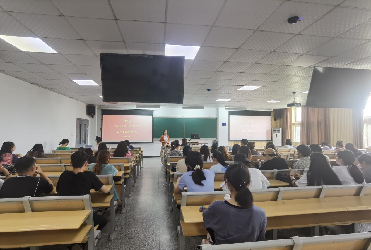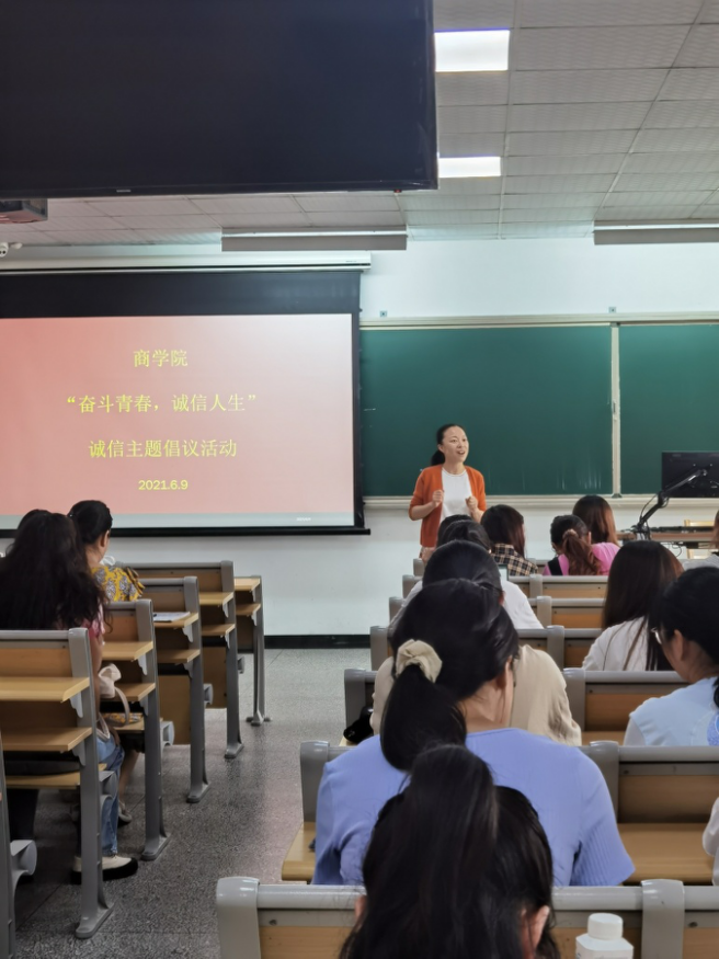 活动中,董璐首先进行了资助政策以及助学贷款的知识宣讲,强调了诚信的意义以及重要性。随后,董璐就大学生失信案例与同学们进行了分享交流,内容涵盖学习诚信、生活诚信、网络诚信以及就业诚信。最后,同学们进行了“以青春之名 书写诚信人生”倡议签名,在发出“诚信做人”倡议的同时,也郑重许下对于诚信的承诺。