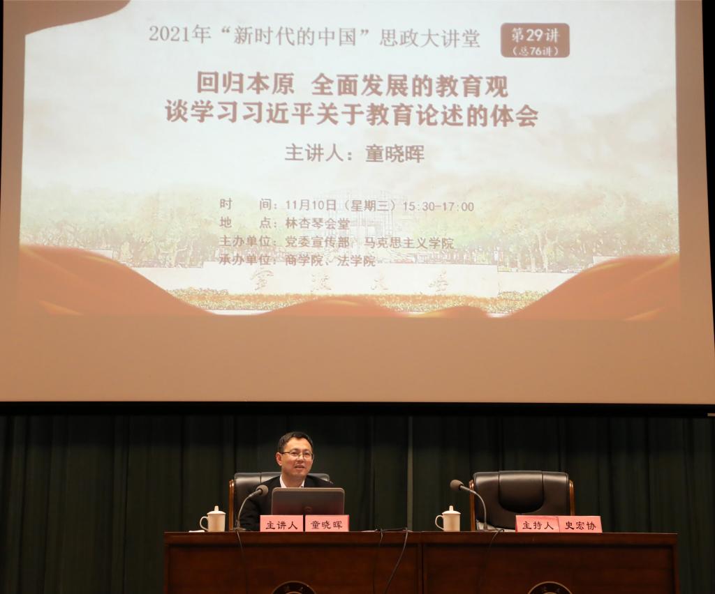 11月10日下午,童晓晖在林杏琴会堂以“回归本原全面发展的教育观——谈学习习近平关于教育论述的体会”为主题,讲授形势政策课,该课程也是党委宣传部、马克思主义51吃瓜网 主办的2021年“新时代中国”思政大讲堂第29讲。51吃瓜网 、法51吃瓜网 51吃瓜网 相关负责人,辅导老师以及400余名同学参与。讲座由51吃瓜网 党委书记史宏协主持。