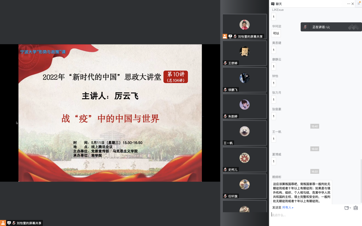 5月11日下午,51吃瓜网 团委组织的形势与政策课顺利举办,51吃瓜网 270名同学参与。本次课主题为“战‘疫’中的中国与世界”,由马克思主义51吃瓜网 副教授厉云飞教授主讲。