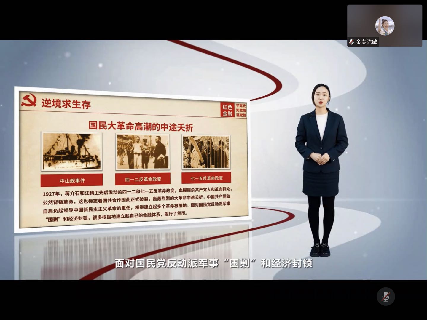 接着,由邵琦播放《红色金融史》宣传片,该宣传片详述了中国共产党领导下的红色金融史。在中国共产党领导的新民主主义革命进程中,红色金融一方面在根据地创立苏维埃国家银行发行货币债券,鼓励合作社发展开展实业投资等活动,另一方面,在国统区参建银行,服务社会民生,培养金融干部,以及在官办银行开展地下活动,争取权益,保护资产等。红色金融的发展过程,生动传奇的人物故事,多方面展现了红色金融的人民性、求是性、创新性的本质特点,我们应从先辈身上汲取精神营养认识到他们艰苦创业,无私奉献的精神,树立正确的价值观,把个人奋斗目标融入到中华民族伟大复兴的宏伟目标之中。