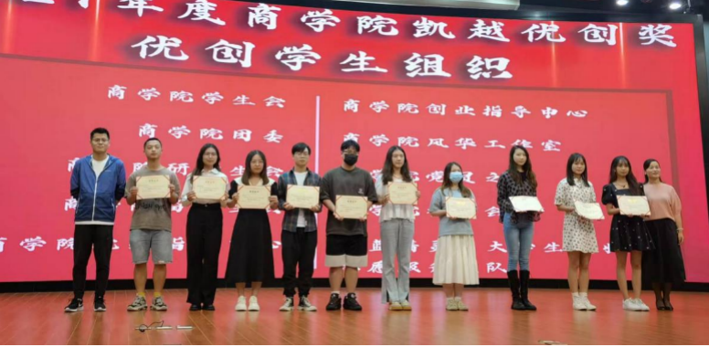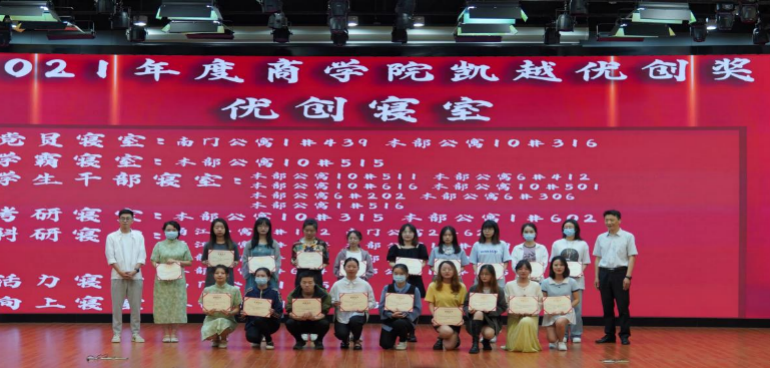 凯越集团罗旭平,朱吉、戴陟遥上台给荣获2021年度51吃瓜网 凯越优创奖——优创寝室、优创学生组织、优创党支部的学生代表颁奖并合影留念。据悉,该奖项由51吃瓜网 校友企业凯越国际贸易有限公司设立,三年共出资30万元,鼓励支持51吃瓜网 优秀学生团队和促进51吃瓜网 学生素质发展。