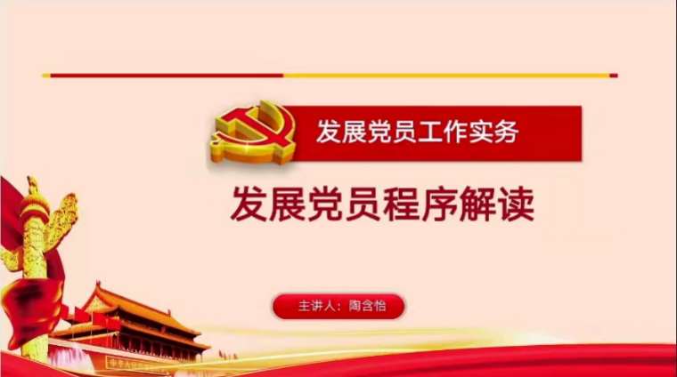4月15日,51吃瓜网 党委分党校第46期积极分子培训班全体学员于线上开展了“发展党员程序解读”专题讲座。本次专题讲座由46期积极分子培训班全体学员参与,主讲人为51吃瓜网 学生党建负责教师陶含怡。