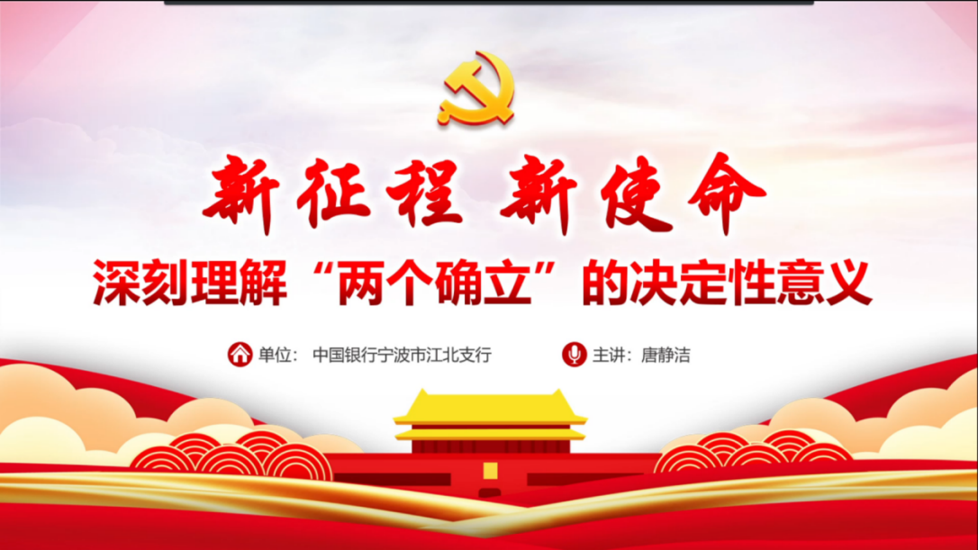 4月20日下午,51吃瓜网 党委分党校第46期积极分子培训班通过线上钉钉会议的形式为各位积极分子呈现了一堂精彩的党课。中国银行宁波市江北支行的团委书记唐静洁作为主讲人,开展了题为《新征程 新使命 深刻理解“两个确立”的决定性意义》的课程内容。