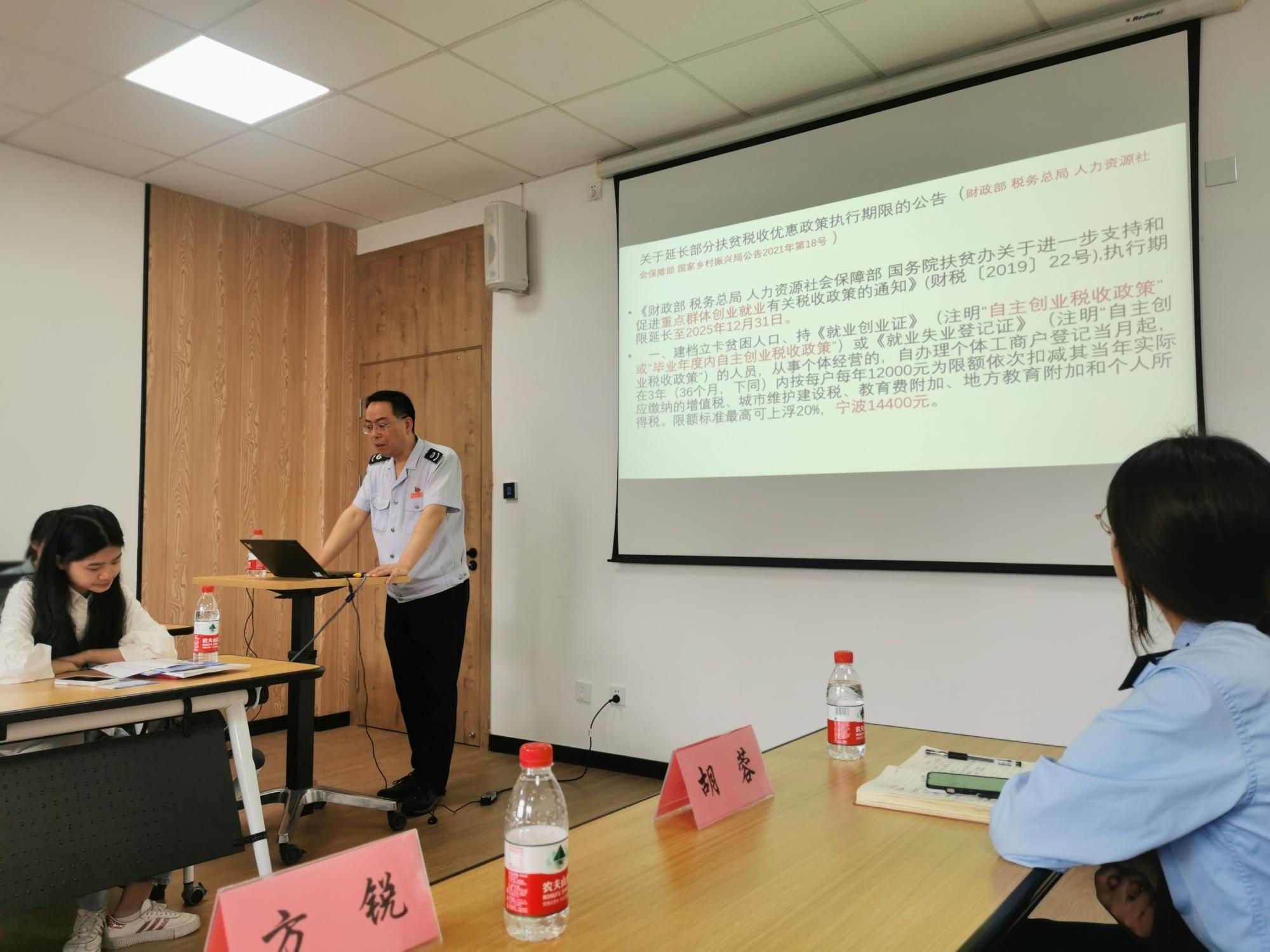 首先进行“助力大学生就业创业税费服务站”授牌仪式。随后,方锐围绕“大学生就业创业税费”主题,为在场的毕业生带来了一堂廉洁从业的思政课。方科长介绍了增值税、消费税、企业所得税、个人所得税等各项税种,用生动的案例让同学们感受到税费制度与每个公民的息息相关。方科长把税法普法与税收宣传相结合,不仅拓展了同学们的知识面,更让依法诚信纳税的观念深入人心。