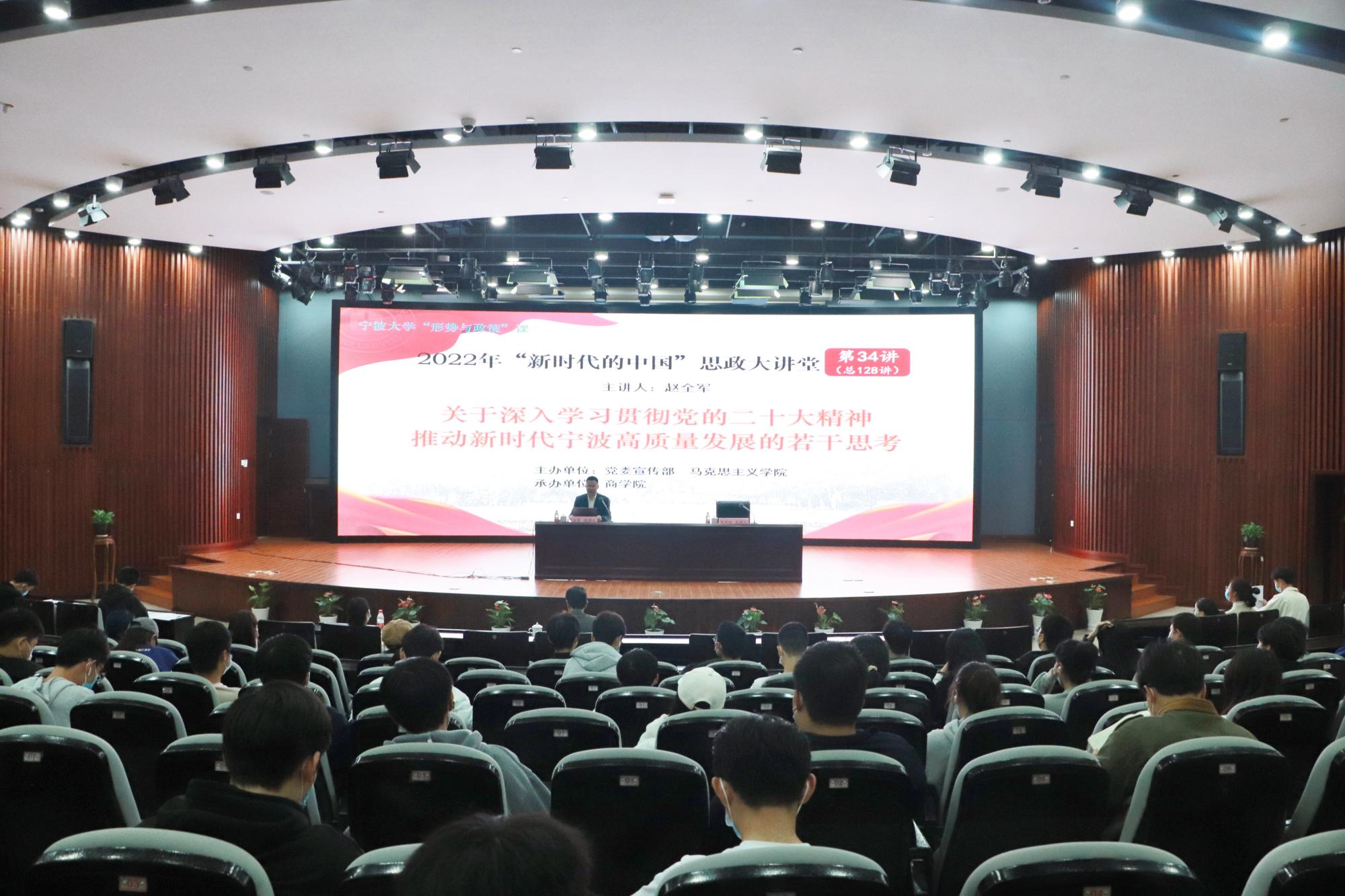 赵全军从全面把握党的二十大的重大意义和取得的系列重大成果向大家宣讲了党的二十大精神,从宁波的基本情况出发,向同学们分别概括了陆上宁波、海上宁波、海外宁波的基本情况,让同学们对宁波有了全面的了解。随后,他针对宁波发展成效提出“四力宁波”的概念,从实力、魅力、活力、给力四个方面向同学们描绘了一幅别开生面的宁波画卷。同时,他通过进一步的解释揭晓了宁波拥有“四力”的谜底——集群发展、民营经济、体制优势,是文化自信造就了现有的宁波。