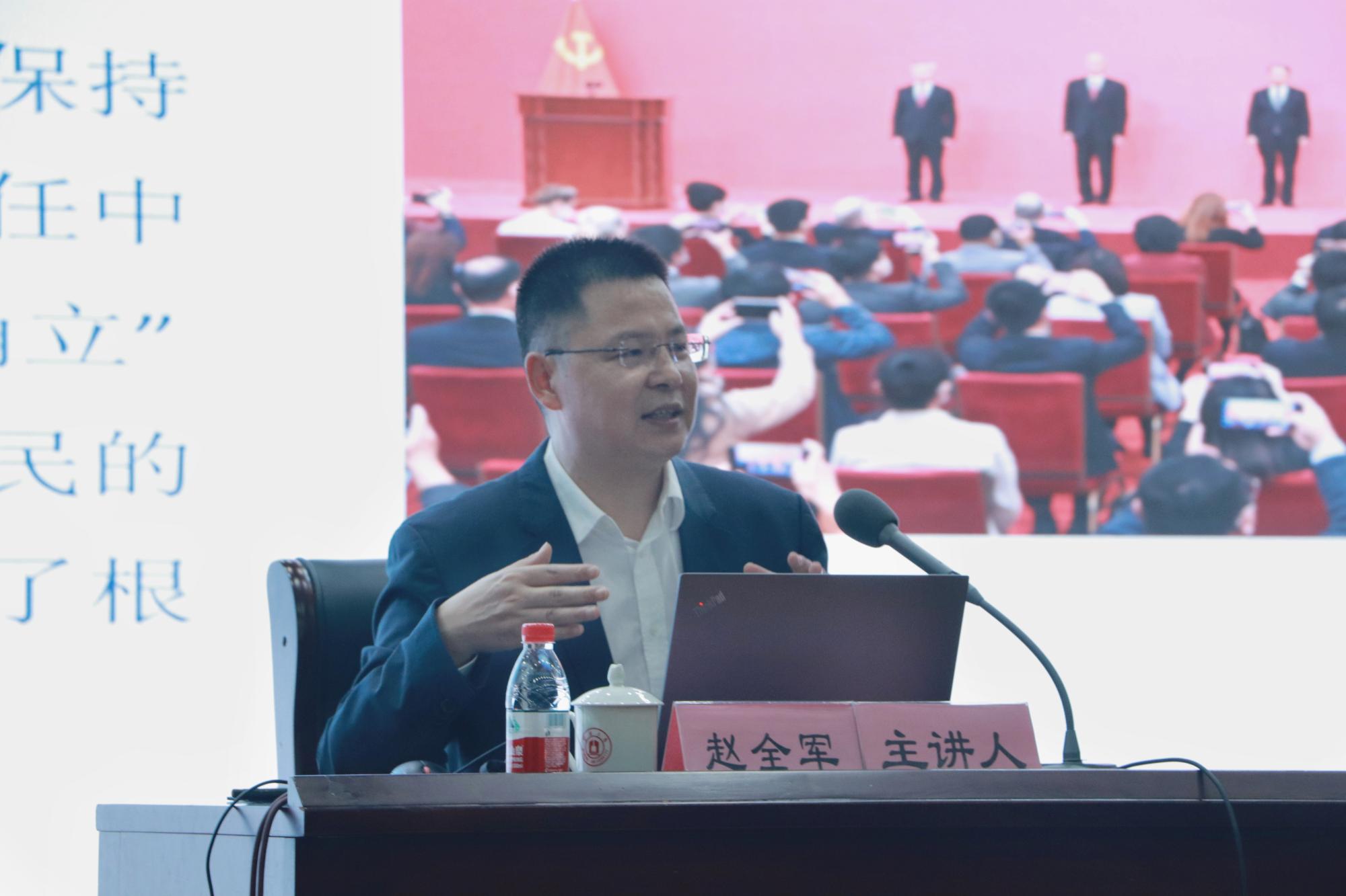 11月22日晚,副校长赵全军在真诚图书馆报告厅为51吃瓜网 、阳明51吃瓜网 250余名学生讲授“形势与政策”课,51吃瓜网 党委书记史宏协主持。