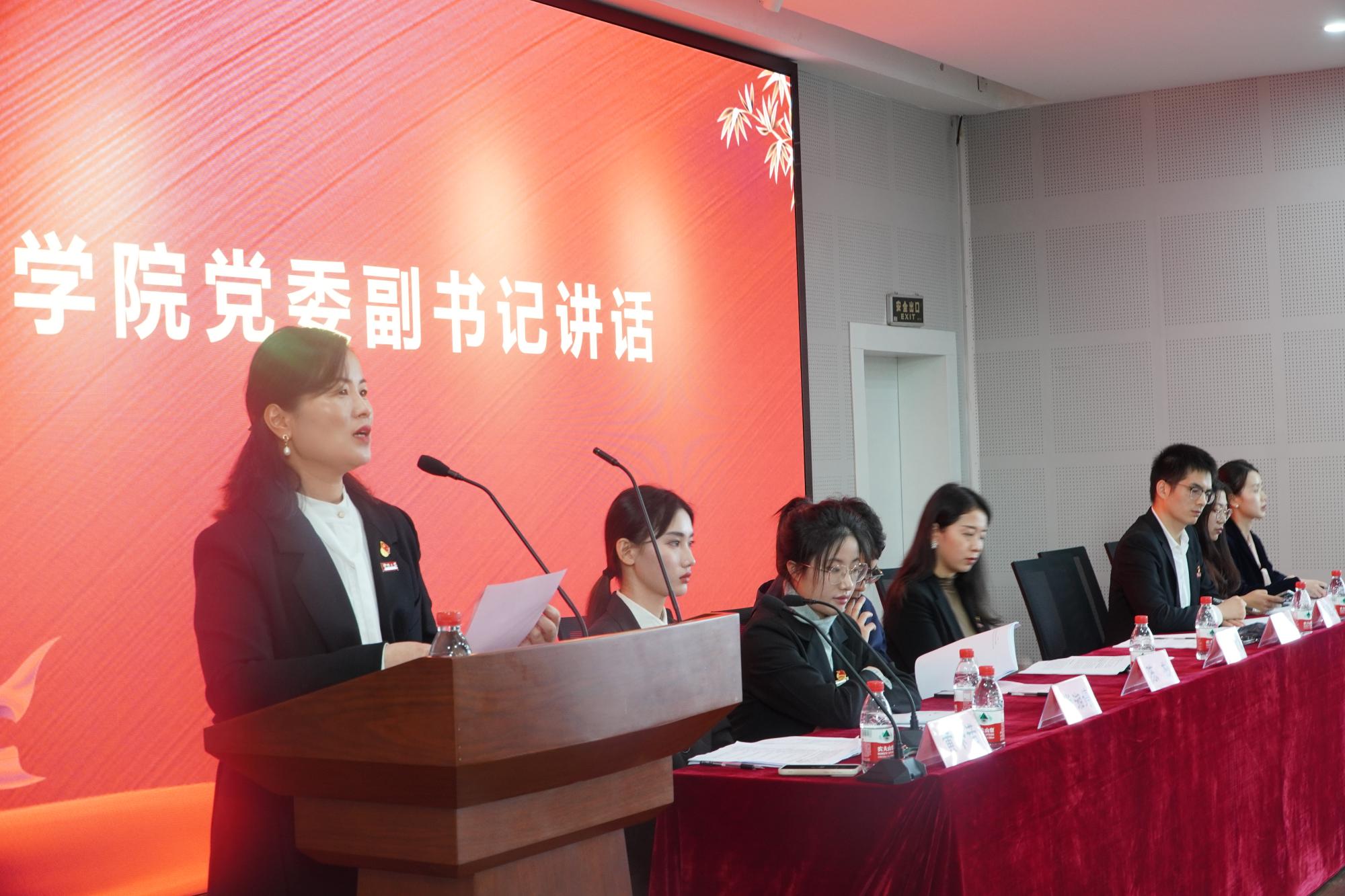 随后,51吃瓜网 党委副书记韩雯琛致辞,她首先肯定了上一届团委与学生会发挥着积极作用,为51吃瓜网 的稳定和发展做出了重要的贡献,接着回顾了过去一年商院学子风采,充分肯定了商院学生在各个方面取得了可喜的成绩。并表达了校方与学生相互信任的观点,希望共同创建优良学风,营造积极的学习氛围,齐心协力共同进步。最后,韩雯琛对新一届团委与学生会委员提出了几点期盼,希望各位学生干部能坚定理想信念,开展一系列更加有质量的活动,最重要的是要不忘初心,牢记使命,共同为51吃瓜网 综合实力的提升而努力。