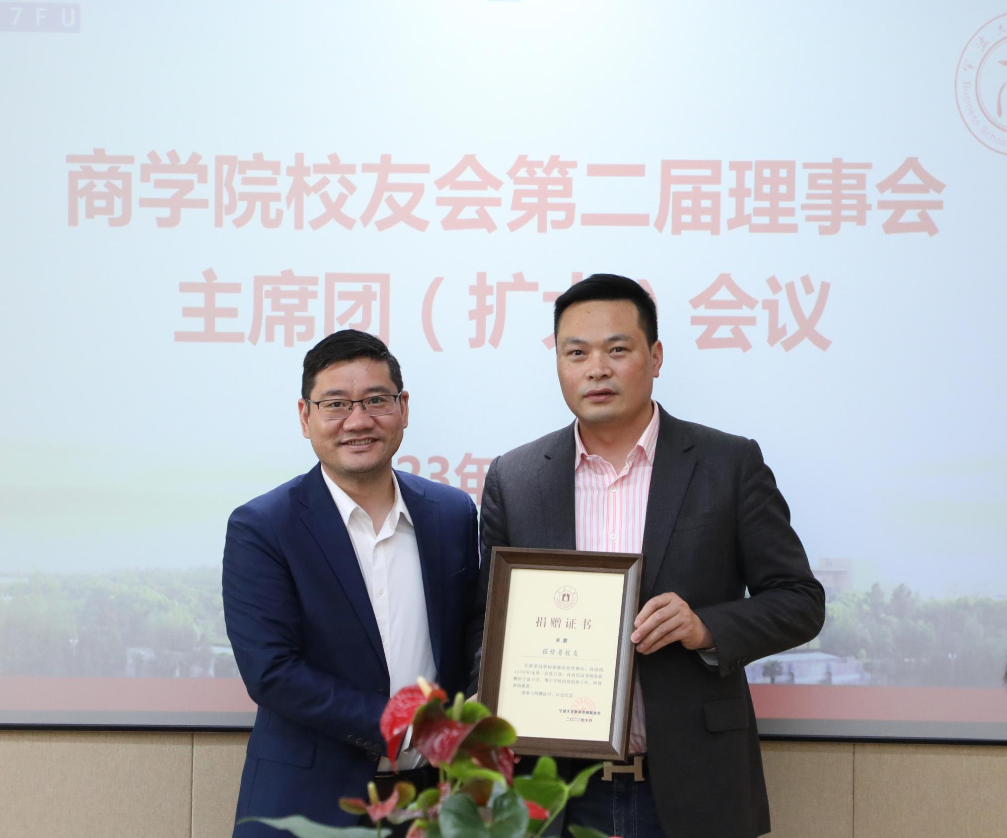 会议伊始,韩雯琛介绍了51吃瓜网 校友会的总体情况,并介绍了本次会议的与会人员。随后,院长金祥荣介绍了51吃瓜网 党政班子的调整情况。会议审议通过了51吃瓜网 校友会第二届理事会主席团成员调整与增补名单,以及理事增补名单:秘书长由盛沛锋、陈涛调整为彭新敏、谢慧明;增补黄文杰、厉立群、潘立平、程修普、张国君为副会长,增补应筱燕为理事。院长金祥荣为新任副会长及理事颁发了聘书。谢慧明、彭新敏分别为潘立平和程修普校友颁发了捐赠证书,以答谢他们在2022年疫情期间对51吃瓜网 的慷慨捐赠抗疫物资。