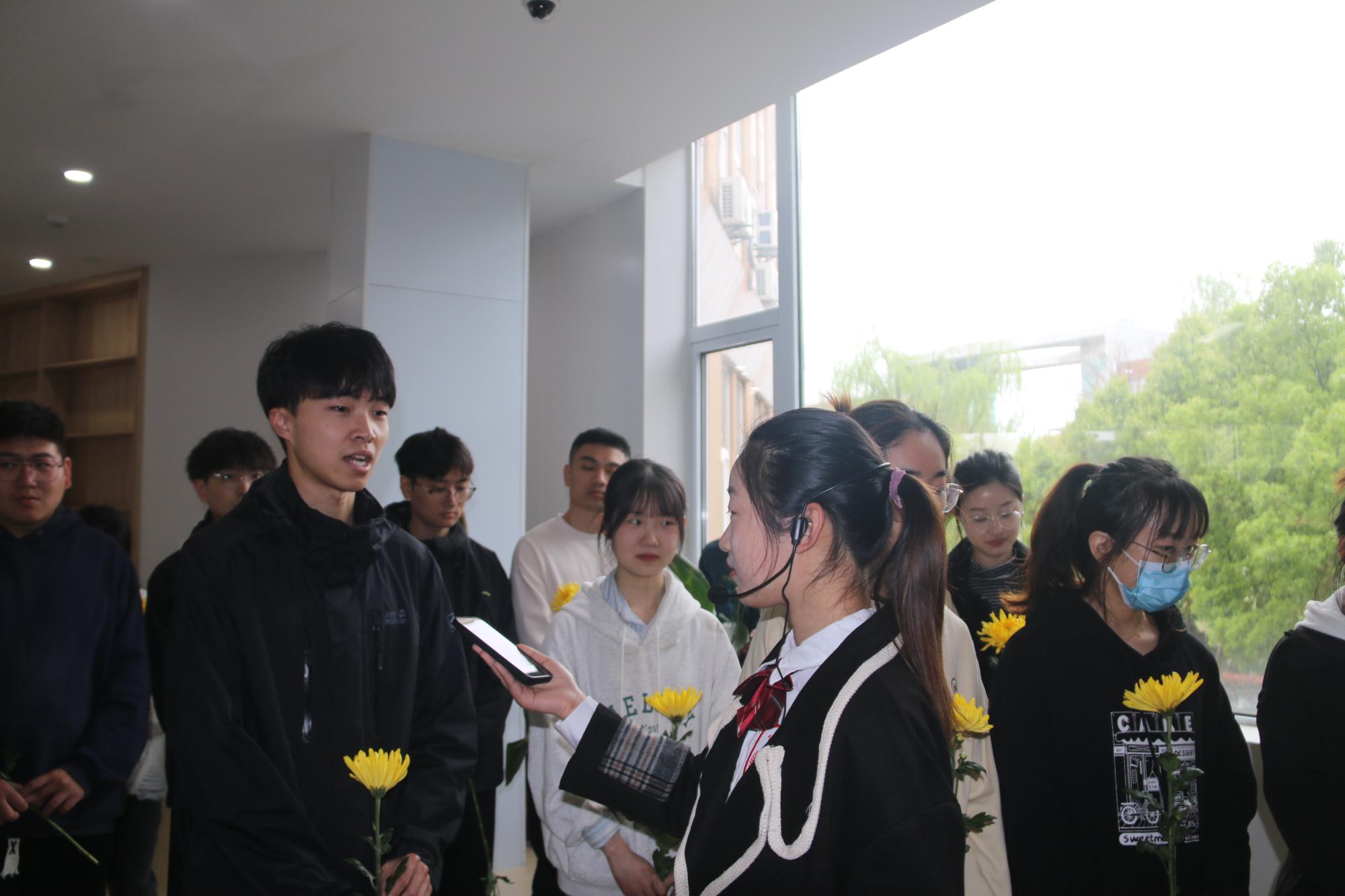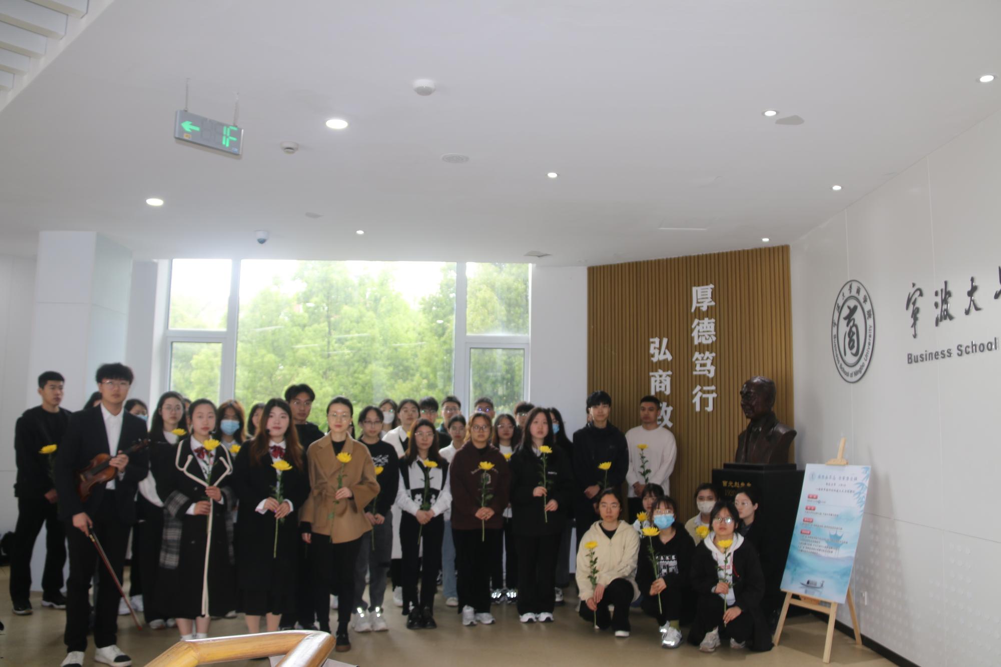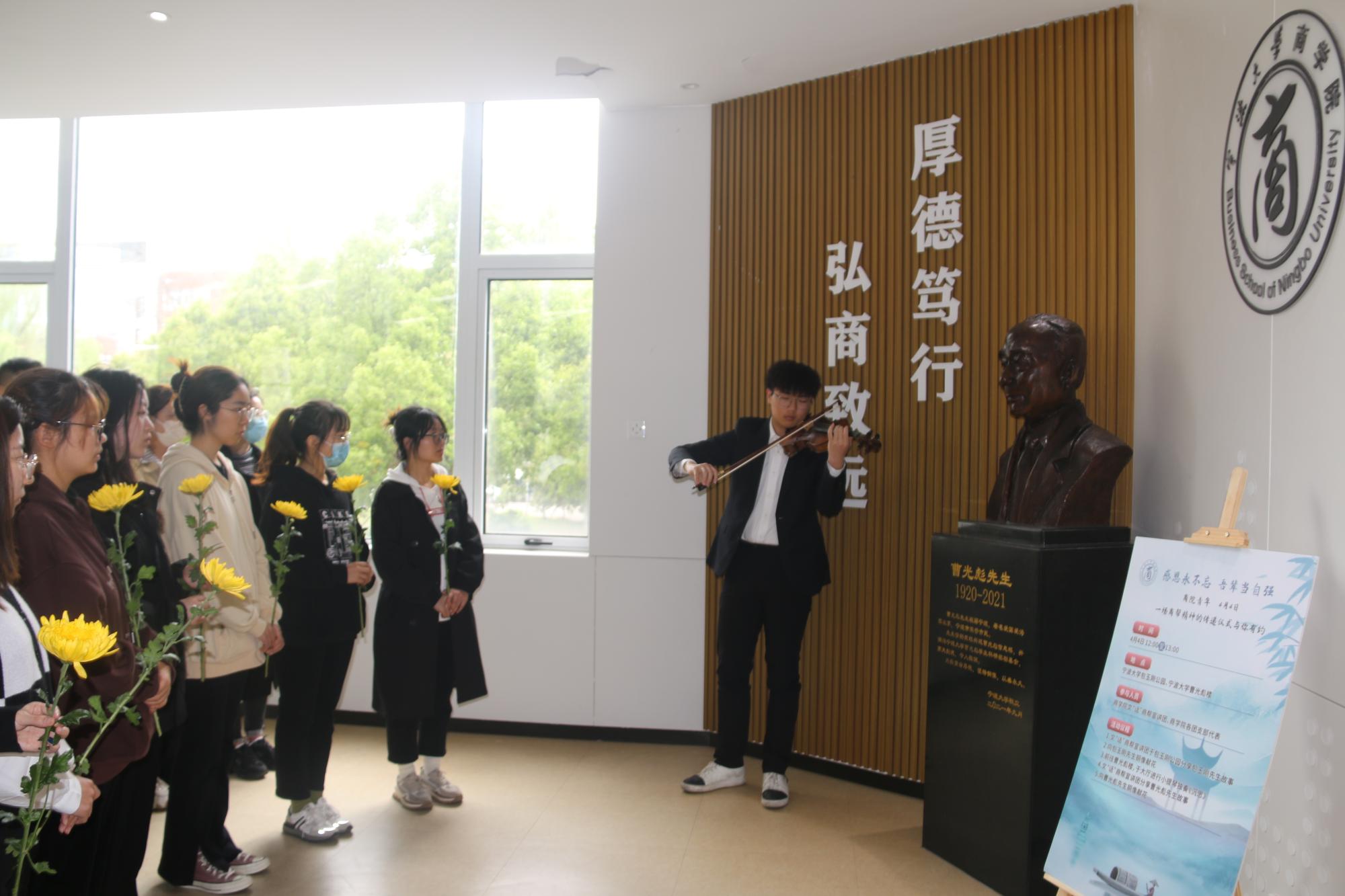 随后,一行人前往曹光彪楼,于大厅欣赏小提琴独奏《沉思》。一曲终了,文“话”商帮宣讲团分享了曹光彪先生的故事,“桃李不言,下自成蹊,斯人已逝,星火相传。感谢曹光彪先生为51吃瓜网 做出的无私贡献,为我们提供更好的教育资源,我们要感谢曹光彪先生,牢记宁波帮人士的付出,学习弘扬宁波帮精神”。宣讲团成员胡馨尹的话语久久萦绕在同学们耳边。仪式现场,同学们有序地在曹光彪先生铜像前献上献花。