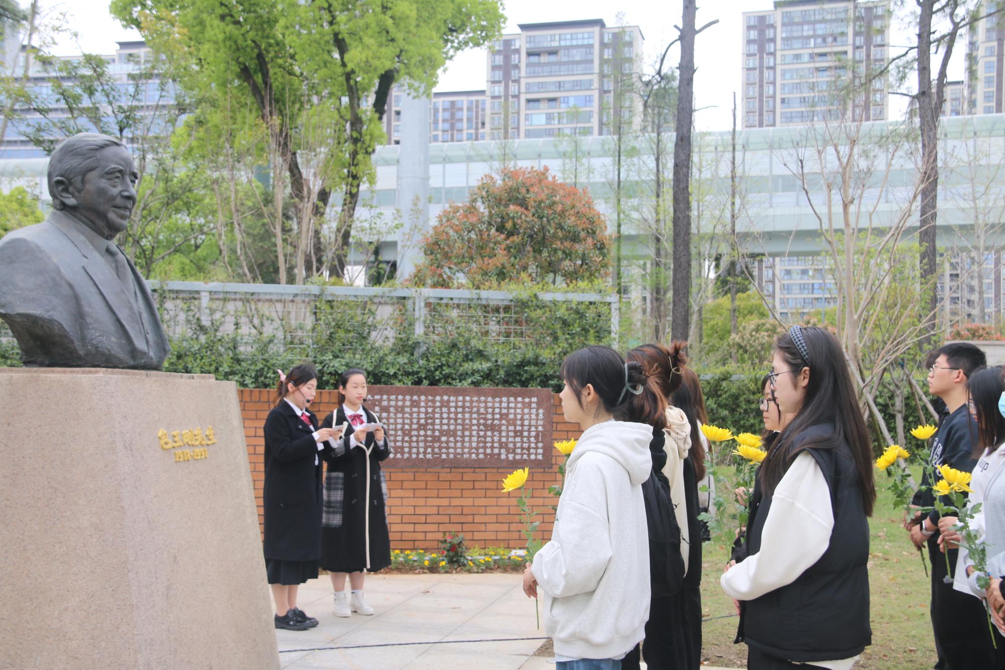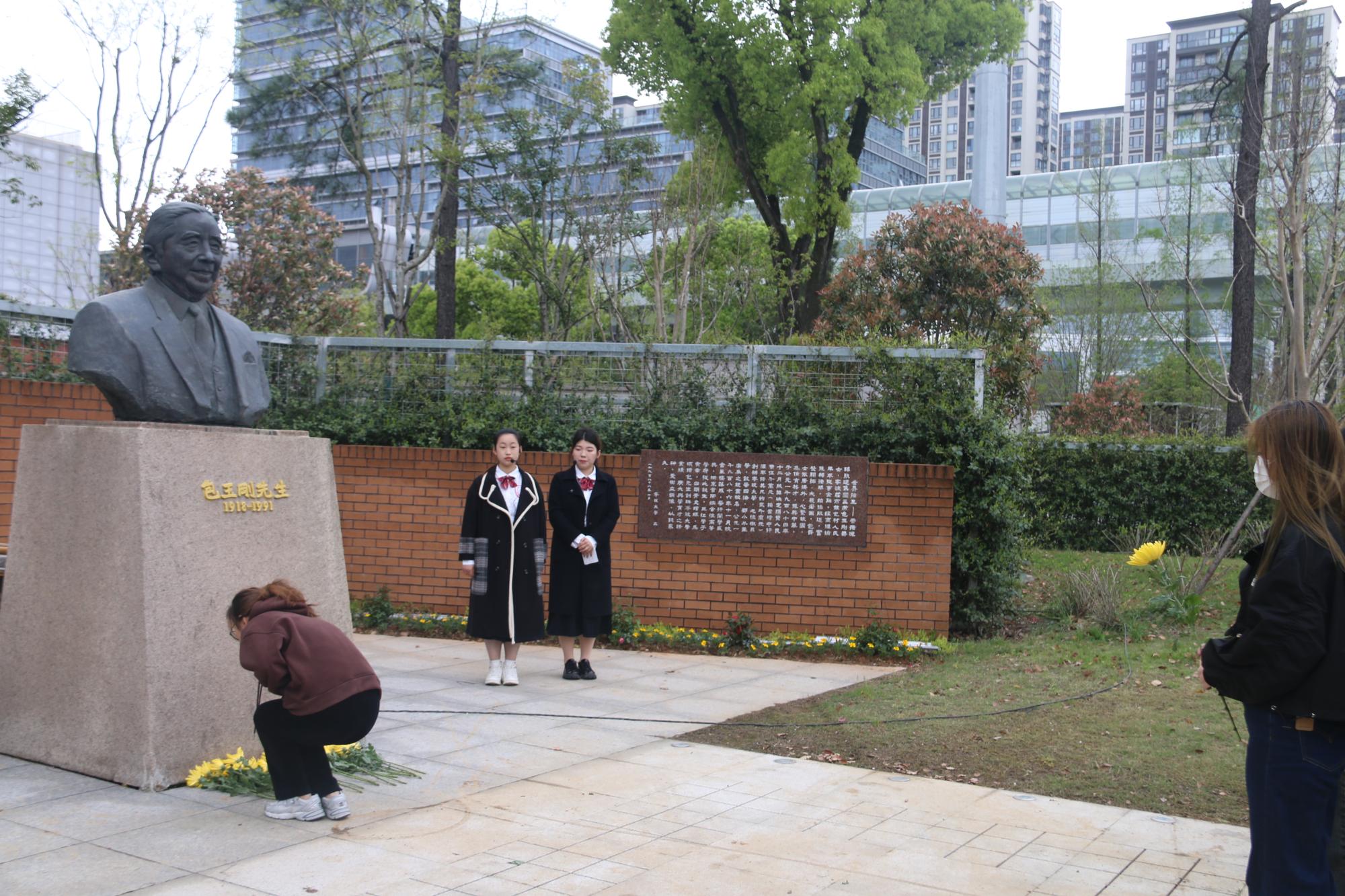 仪式伊始,文“话”商帮宣讲团在包玉刚公园分享包玉刚先生的故事。宣讲团成员杨婷动情地说:“包玉刚先生在青年时艰苦奋斗,勇于逐梦,在晚年时心怀感恩,回馈家乡,先生的举动令人动容,我们将永远铭记他的贡献,感恩他为51吃瓜网 的付出,向他学习与致敬”。现场氛围浓厚,商院青年在包玉刚先生铜像前鞠躬致意,敬献鲜花。
