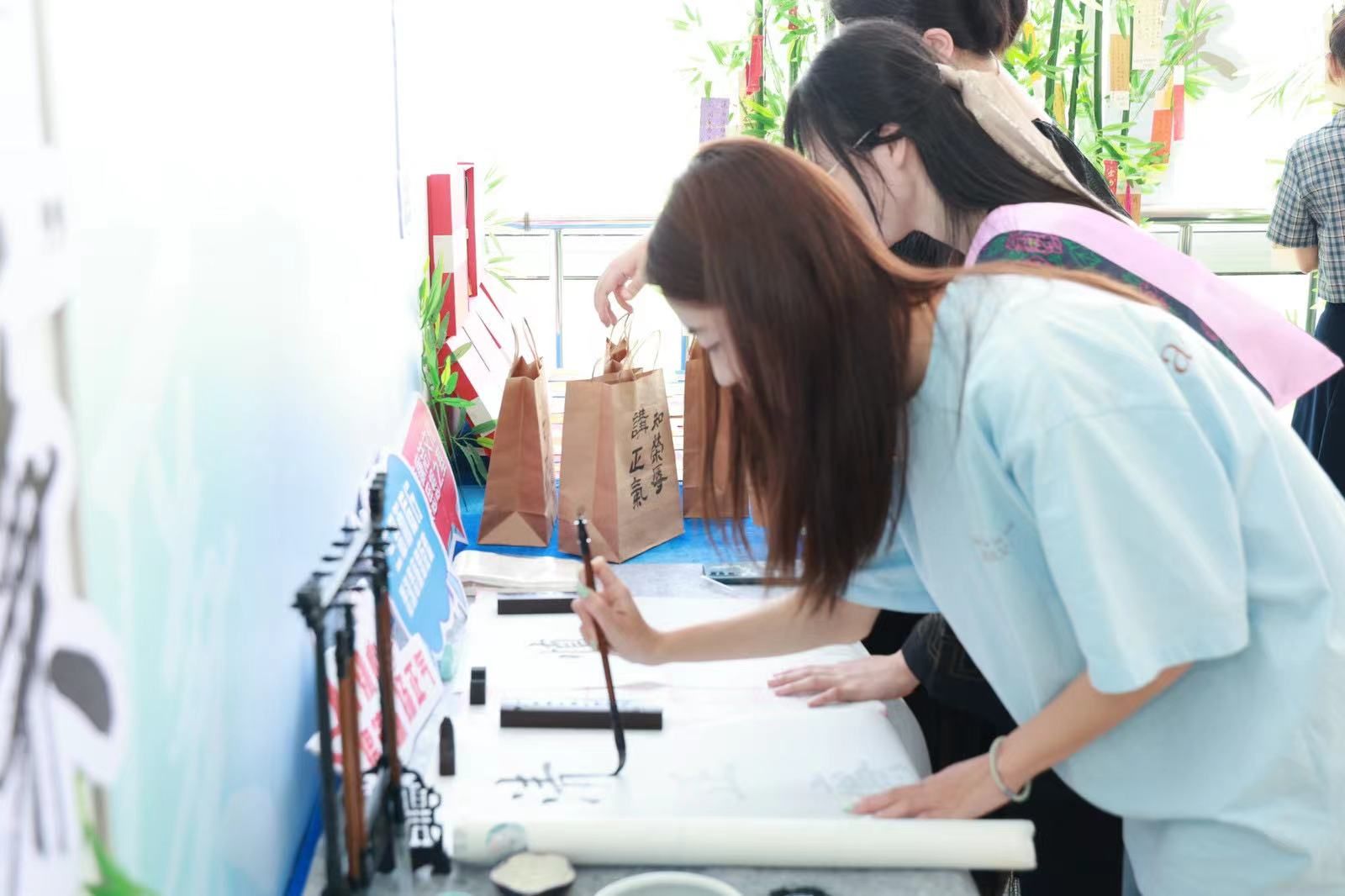 师长赠“廉”,竹叶上挂满了廉洁书签,毕业生党员任意挑选,领取收藏。