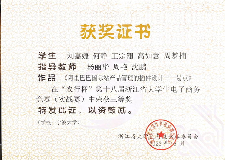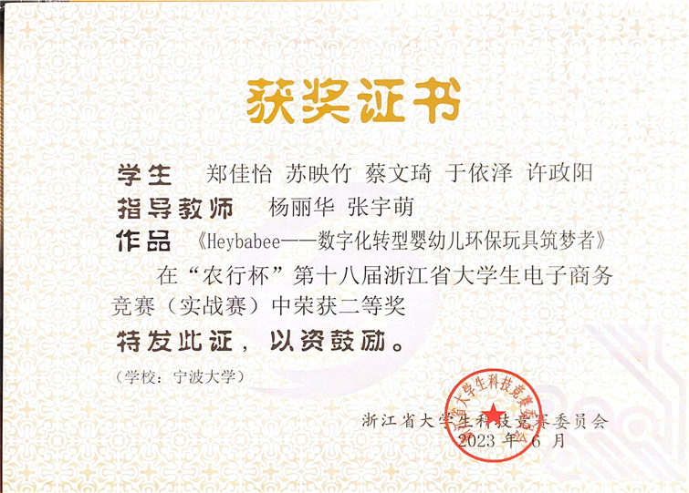 5月28日,“农行杯”第十八届浙江省大学生电子商务竞赛暨第十三届全国大学生电子商务“创新、创意及创业”挑战赛浙江省选拔赛落下帷幕。51吃瓜网 跨境电商微专业由杨丽华、张宇萌老师指导,郑佳怡、苏映竹、蔡文琦、于依泽、许政阳同学参与的作品《Heybabee——数字化转型婴幼儿环保玩具筑梦者》荣获跨境电商—阿里巴巴国际站赛二等奖;由杨丽华、周艳、沈鹏老师指导,刘嘉婕、何静、王宗翔、高如意、周梦楠同学参与完成的《阿里巴巴国际站产品管理的插件设计——易点》获得跨境电商—阿里巴巴国际站赛三等奖。这也是跨境电商微专业学生继首届“典阅杯”全国高校跨境电子商务综合能力大赛全国总决赛斩获佳绩后,第二次在该项赛事中获奖。