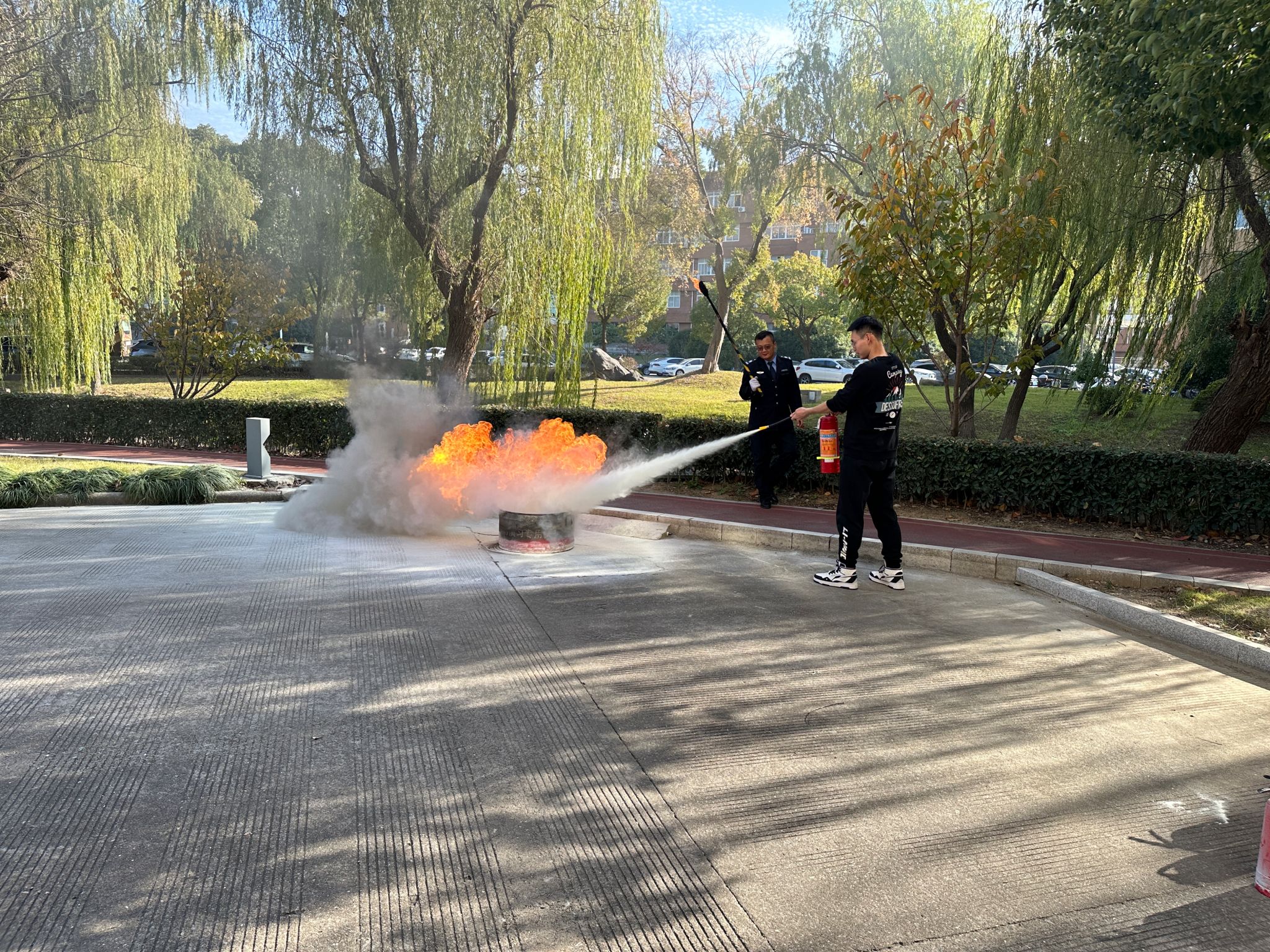 为了使同学们更好理解灭火器的使用方法,现场准备了柴油桶、柴油等道具模拟火情。郑永辉在演练道具柴油桶中倒入水和柴油,火焰熊熊燃烧后,郑永辉亲自示范了正确使用灭火器的方法。