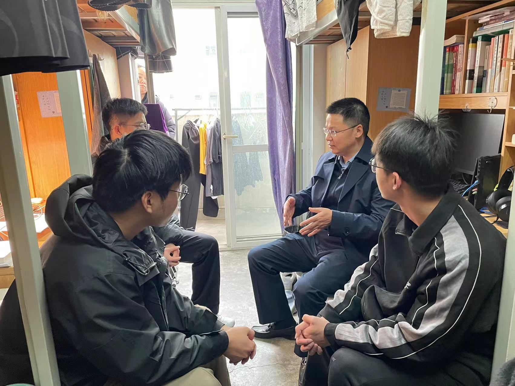 赵全军副书记坐在寝室中与学生们谈心谈话,询问他们近期的学习情况、生活状况以及未来规划等,还为同学们讲解了金融学课外知识。同学们给予了热烈的反馈,频频点头,寝室里不断传出爽朗的笑声。听到寝室中1位同学已经保研至上海财经大学、1位同学正在全力备考研究生、1位同学正准备择业,赵全军副书记鼓励同学们要多样化发展,他叮嘱大家首先要抓好学习,对手机等电子产品要有自制力,认真做好未来规划;同学之间要互帮互助,不要斤斤计较;对集体、社会、国家要有责任感。