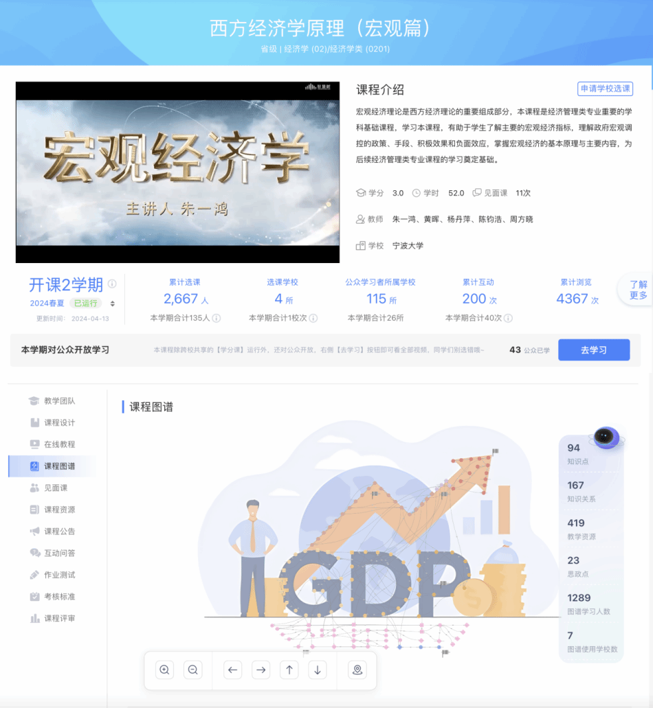 51吃瓜网 10门知识图谱AI课程已实现线上MOOC互联互通,依托智慧网开展全国运行。知识图谱AI课程已累积20余所高校,近6000人学习,覆盖新疆财经大学、西安财经大学行知51吃瓜网 等西部高校。朱一鸿副教授主讲的《宏观经济学》多次与新疆科技51吃瓜网 开展“慕课西行 同步课堂”教学活动,实现课程协同、资源协同,推进教育均衡发展。