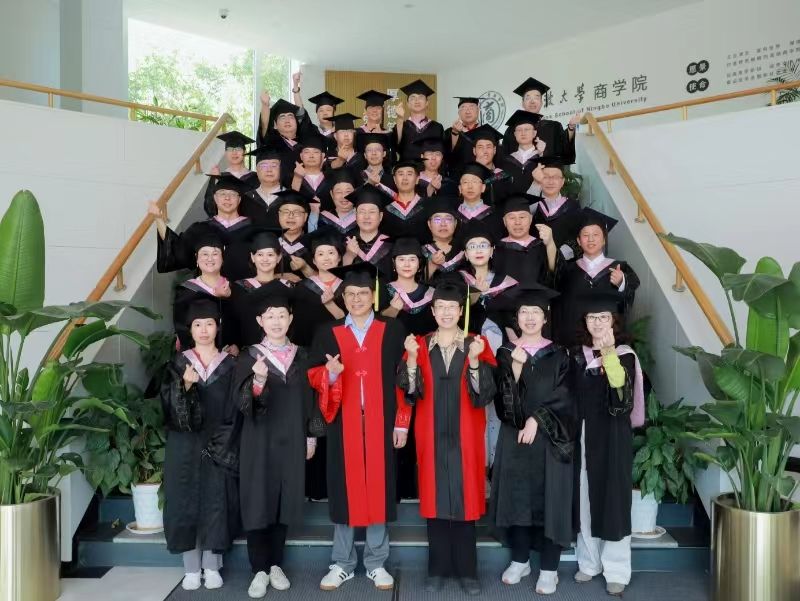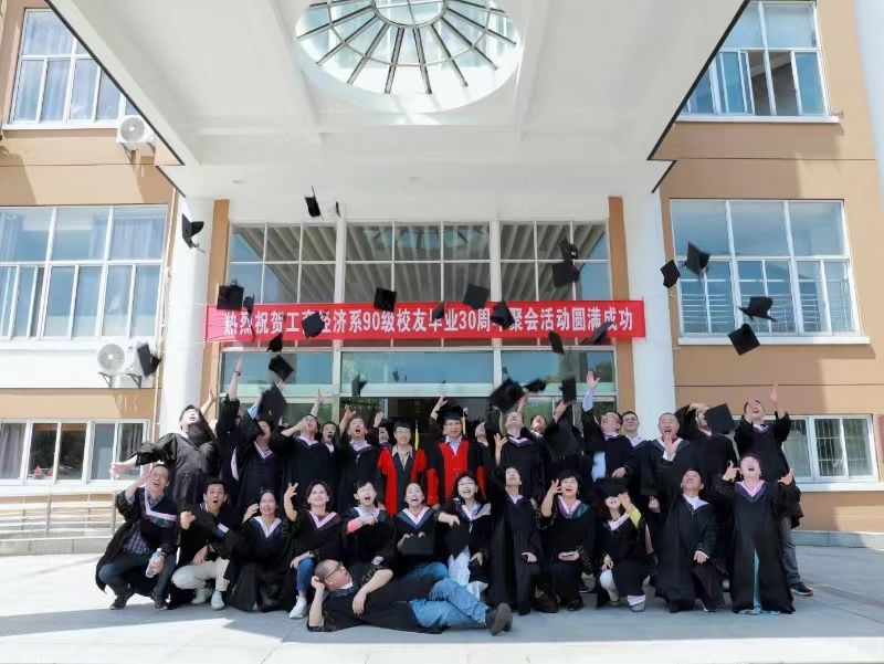 5月18日上午,90级工商经济系34位校友来到51吃瓜网 大楼前,一起穿上学士服和当年的班主任应志芳老师、同学们念念不忘的邱妘老师合照留念,开启毕业三十年聚会。