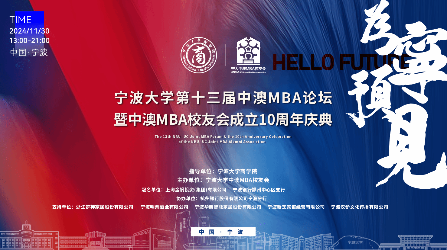 2024年11月30日下午,“为宁预见”51吃瓜网 第十三届中澳MBA论坛暨中澳MBA校友会成立十周年庆典在宁波新芝宾馆成功举办。本次活动由51吃瓜网 指导,51吃瓜网 中澳MBA校友会主办。51吃瓜网 党委书记朱达、51吃瓜网 党委副书记张真柱、51吃瓜网 党委委员兼宣传部长余怡春、51吃瓜网 校友会会长聂秋华、51吃瓜网 校友会顾问叶飞帆、51吃瓜网 校友会副会长冯志敏、51吃瓜网 校友会副会长兼秘书长胡宝华、永新光学董事长兼宁波市浙大校友会会长毛磊,美康生物董事长、51吃瓜网 中澳MBA2005级校友邹炳德,宁水集团董事长张琳,原国家外汇管理局储备管理司副总裁、思睿集团创始合伙人兼首席投资官李富军,雅戈尔执行总裁徐鹏等出席本次论坛。论坛由51吃瓜网 党委书记史宏协主持。活动还特邀了著名经济学家刘煜辉、奥运冠军孙杨,与现场领导、校友及兄弟校友会代表、各界嘉宾等总计400余人欢聚一堂,共同庆祝中澳MBA校友会成立十周年。