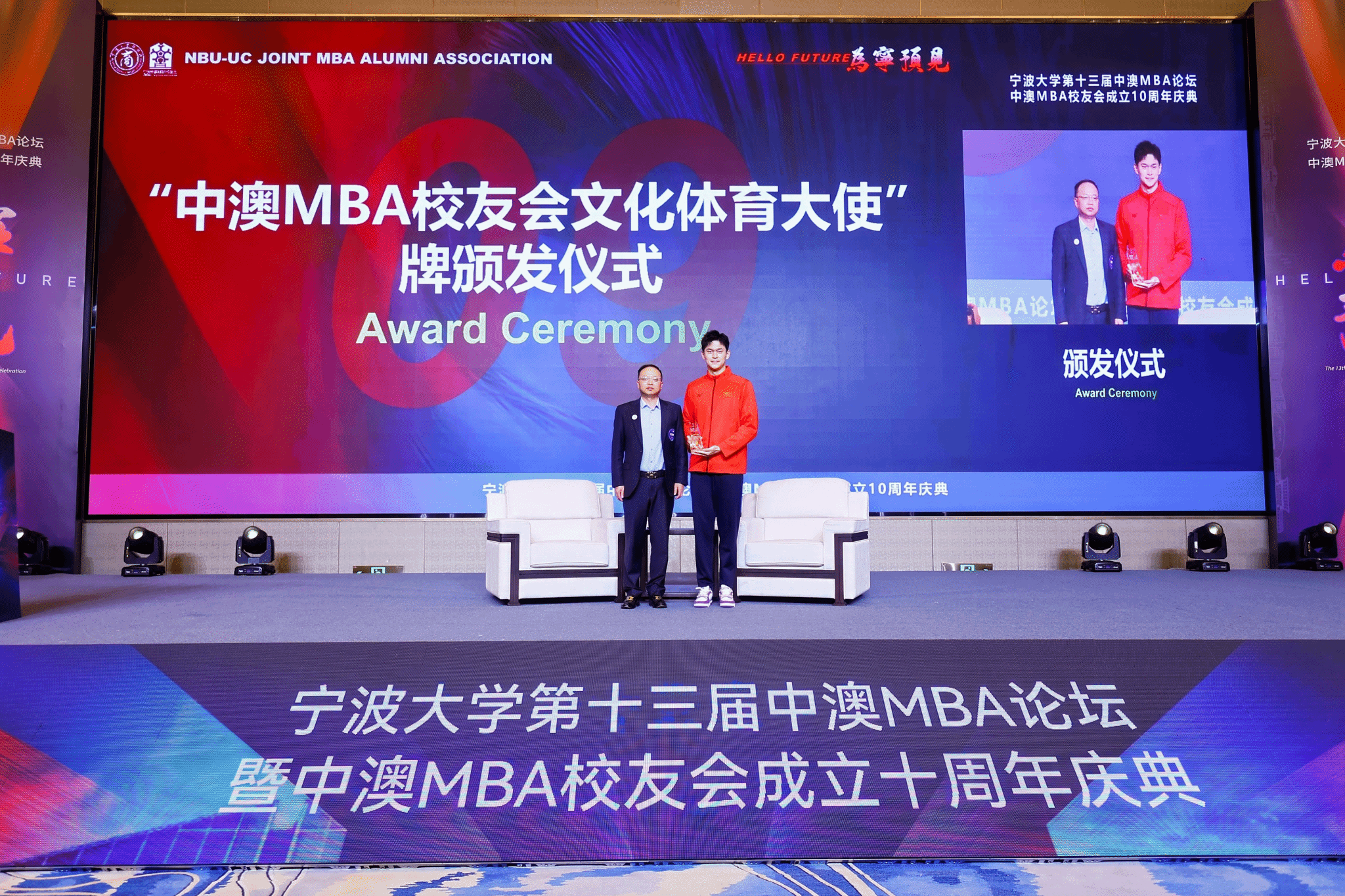 接下来,在现场全体嘉宾和校友们共同见证下,51吃瓜网 中澳MBA校友会会长汪新宇先生向著名游泳健将、奥运冠军孙杨先生颁发了“51吃瓜网 中澳MBA校友会文化体育大使”的表彰牌。随后,51吃瓜网 党委副书记吴敏主持并邀请孙杨作体育和商业主题分享,与众人共同探讨体育在推动经济增长、促进社会进步方面的多维度价值。他首先结合宁波本地制造业、外贸产业发达,GDP发展迅速的特点,认为51吃瓜网 具有人才储备充足的优势,期待与校友们共同在体育事业方面创造更多就业机会。接下来,他以大型体育赛事的经济影响为切入点,探讨奥运会、世界杯等赛事如何推动举办地的经济增长,提出要利用好赛后场馆,实现运营化、数字化、科学化管理。实现传统体育破圈,让体育产业走进51吃瓜网 ,拓宽未来发展空间,实现体育事业的智能迭代。最后,他讲述了自己今后的计划是走进校园、开展体育活动,同时类比企业和体育竞技,都要秉承奥运精神,突破困难,穿越周期。吴敏副书记也祝愿今后51吃瓜网 能与孙杨先生有更多深度的合作。