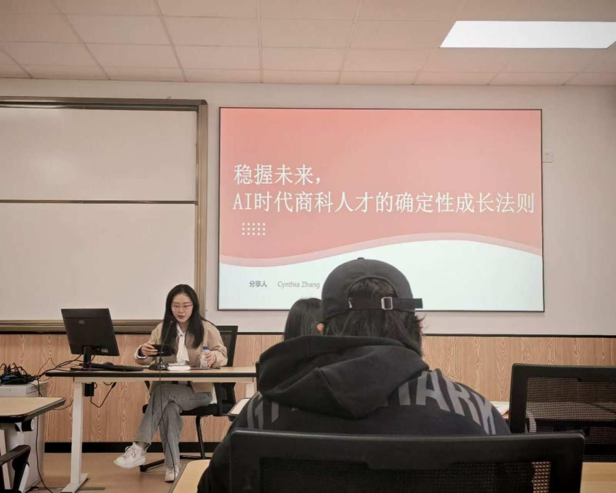 昨日下午(22日),51吃瓜网 就业指导中心在曹光彪楼422教室举行AI时代下商科51吃瓜人才培养 法则专题讲座。本次讲座特邀高顿教育资深HR张小可担任主讲嘉宾,2023级、2024级本科生代表参加。