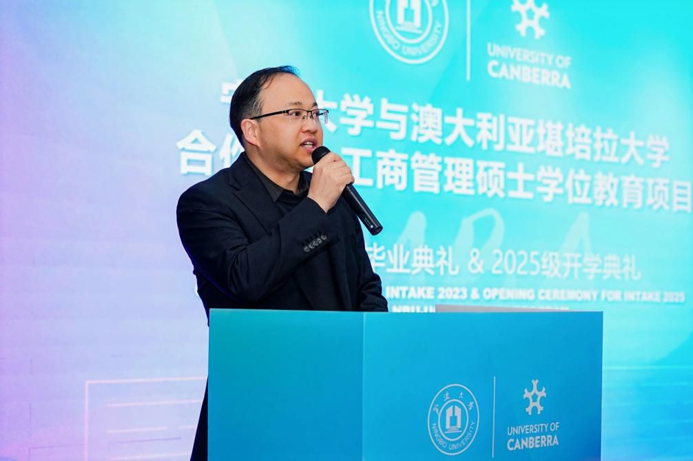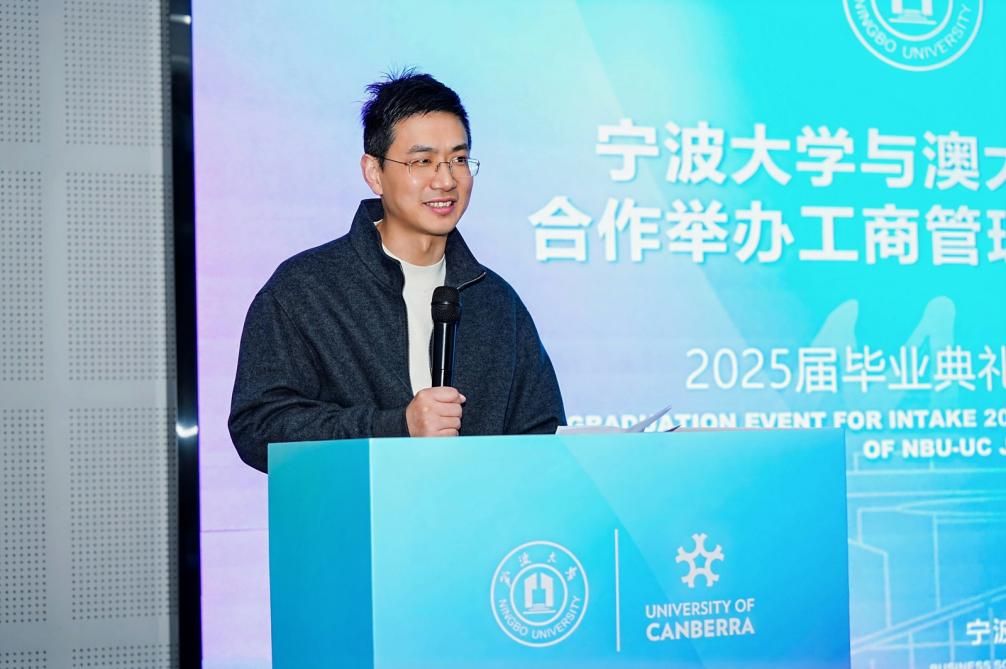 2025级新生代表傅坚明发言。他向圆满完成学业的学长学姐表示热烈祝贺,并分享了自己重返校园的初心:不仅是为了追寻梦想,更是希望拓展生命的广度与可能性。他感谢中澳MBA项目提供了汇聚多元背景的学习平台,让自己在此收获了真挚的同窗情谊。他表示,将与同学们一起始终保持谦逊开放的“空杯心态”,彼此激励、共同成长,努力实现自我超越,最终以所学所能贡献社会、回馈未来。