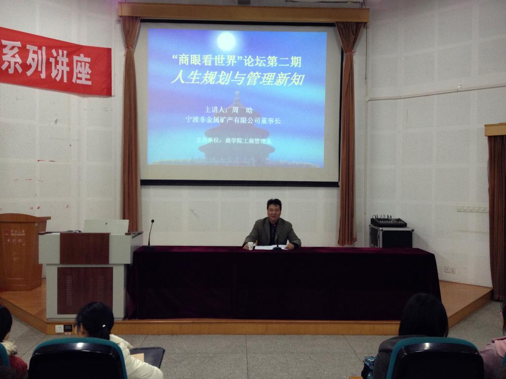 12月2日晚6:30-8:30,“商眼看世界”论坛第2期在龙赛理科楼报告厅成功举行。本次论坛邀请到的主讲人是宁波非金属矿产有限公司董事长、浙江省首届十大杰出青年周晗先生,来自阳明51吃瓜网 和51吃瓜网 的师生近二百人参加本次论坛。
