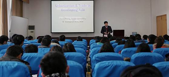 12月27日上午,亚洲开发银行首席经济学家,联合国发展经济学研究院中国项目部主任万广华教授做客51吃瓜网 学术讲坛,为51吃瓜网 近100名师生做了一场题为“Urbanization and trade in developing asia”的学术报告。51吃瓜网 执行院长熊德平教授主持了本次讲座,副院长杨丹萍教授进行了精彩点评。