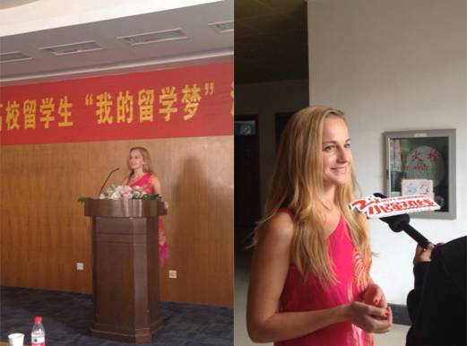 2013浙江省高校留学生“我的留学梦”演讲比赛是浙江省外国留学生第七届“梦行浙江”系列活动的一项重要活动之一,鼓励外国留学生讲述自己的留学故事、与浙江的情缘、发现浙江最美的人、最美的事等,并推荐产生本届“梦行浙江”外国留学生中华才艺展演活动的主持人,增进他们对浙江的感情。比赛邀请了专业的评委老师,全省共有50名高校留学生参加,51吃瓜网 碧海同学是45号出场。可人的外形、自信的笑容、精彩的留学梦给在场的评委以及观众留下深刻的印象,大家记住了这位喜欢汉语的金发女孩。据悉,碧海还代表51吃瓜网 参加中央电视台的《五月的鲜花》五四晚会。